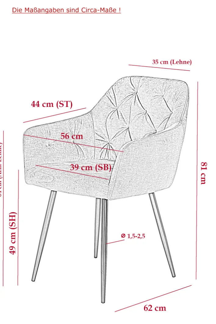 Breite: 56 cmHöhe: 81 cmTiefe/Ausladung: 62 cmGewicht: 6,5 kgSitzbreite: 39 cmSitztiefe: 44 cmSitzhöhe: 49 cmmaximale Belastbarkeit: 120 kgHöhe Rückenlehne: 32 cmHöhe Armlehne: 64 cm