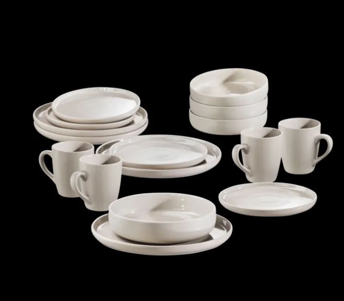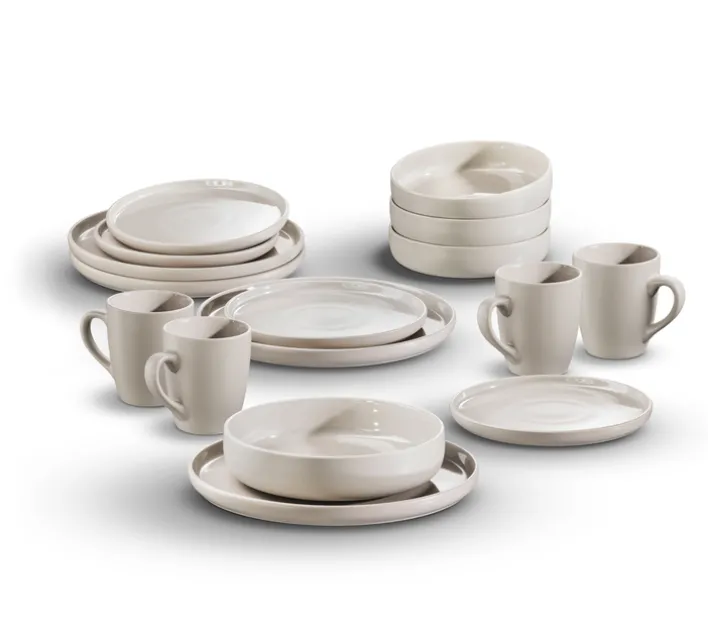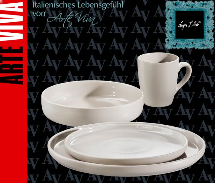 Das Kombiservice „CITY“ von Arte Viva bietet eine stilvolle und praktische Lösung für den täglichen Gebrauch und besondere Anlässe. Dieses Set besteht aus 16 Teilen, darunter Kaffeebecher, Dessertteller, Schalen und flache Teller, jeweils in vierfacher Ausführung. Die Hauptfarbe Beige verleiht dem Service eine elegante und zeitlose Optik, die sich nahtlos in verschiedene Einrichtungsstile einfügt. Die runde Form und die glatte, glasierte Oberfläche aus Steinzeug-Keramik unterstreichen den glamourösen Stil des Sets.
