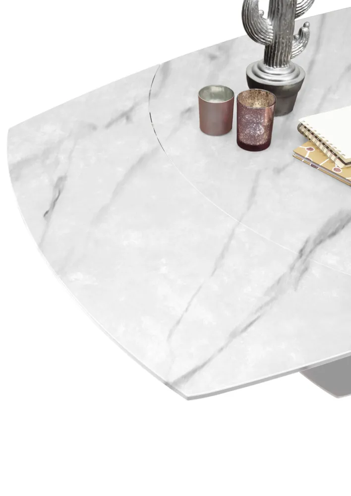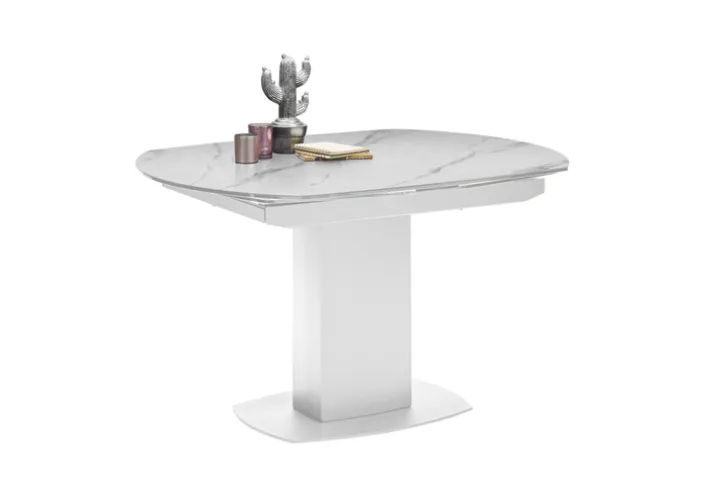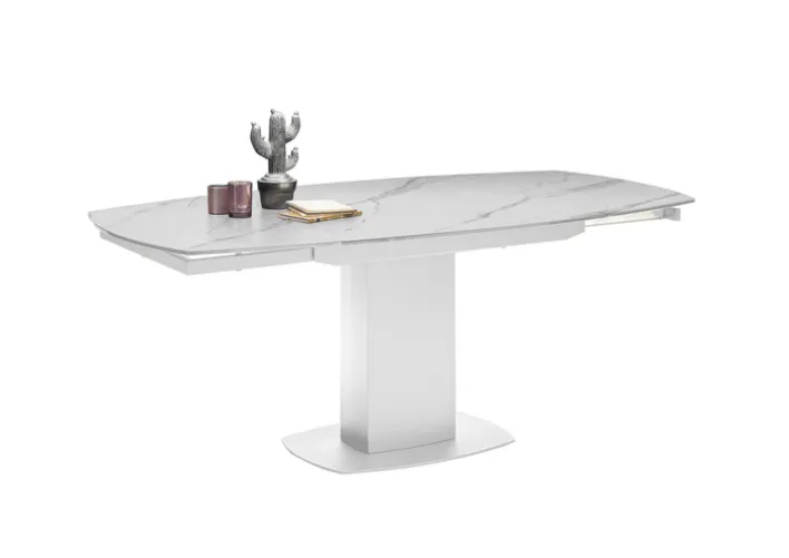 Der elegante Esstisch MICHAEL besticht mit seinem edlen Design in Weiß und Marmoroptik. Der Tisch mit dem schicken weißen Säulenfuß und der edlen Marmorplattenauflage mit den abgerundeten Kanten hat die Standardmaße 120 x 90 cm. Die Tischlänge kann durch praktischen Gestellauszug auf 180 cm verlängert werden und bietet so bis zu 8 Personen ausreichend Platz für gemeinsames Speisen oder gemütliche Spieleabende.