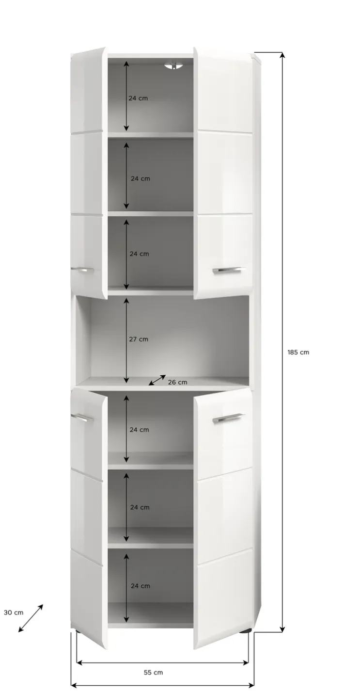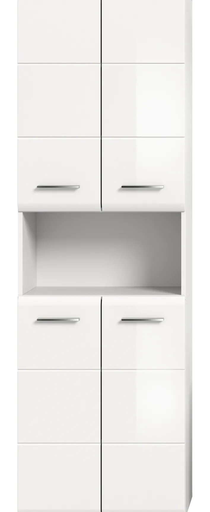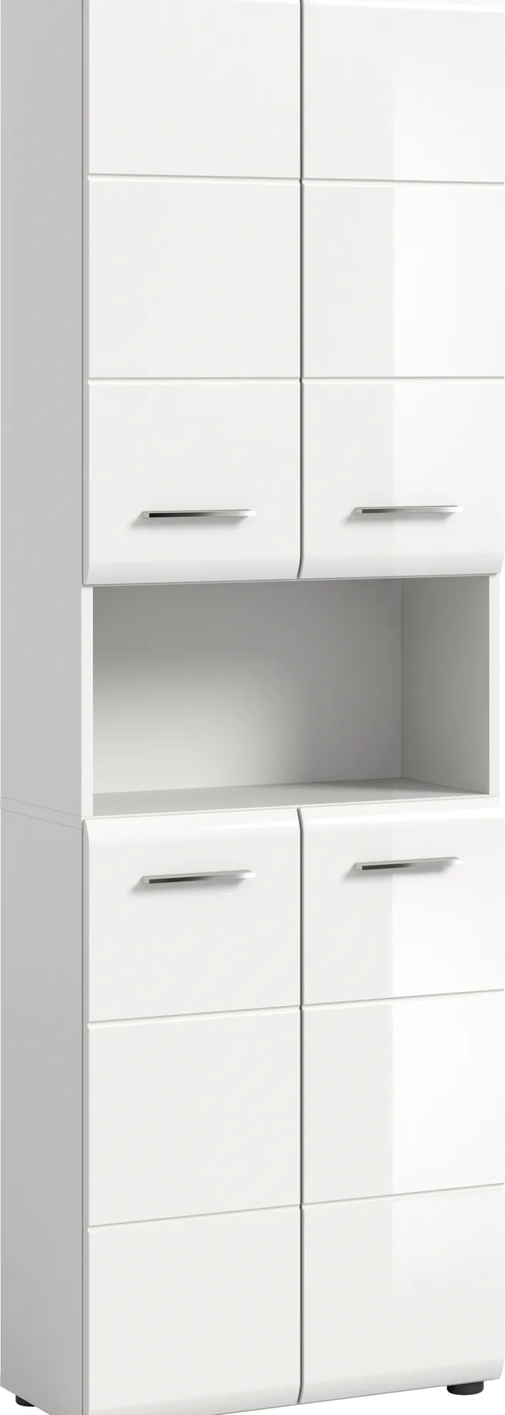 Ein Klassiker für das Badezimmer: der weiße Bad-Hochschrank LOGAN. Er sorgt für reichlich Ablagefläche und Stauraum. Geräumige Schränke wie der Bad-Hochschrank LOGAN sind ein Muss für jedes Badezimmer. Handtücher, Kosmetika, Fön oder Rasierer wollen griffbereit verstaut sein. Für kleine Bäder eignet er sich hervorragend. Denn durch seine Höhe benötigt er wenig Grundfläche für seine zahlreichen Aufbewahrungsoptionen. Vier Türen, vier Einlegeböden und insgesamt sechs Fächer sorgen für Flexibilität. So ist es ganz einfach, jederzeit Ordnung im Bad zu halten. Der Hochschrank ist aus Holznachbildung gefertigt. Mit seinen weißen Hochglanz-Oberflächen und silberfarbigen Kunststoffgriffen passt er sowohl in traditionelle wie modern eingerichtete Badezimmer.
