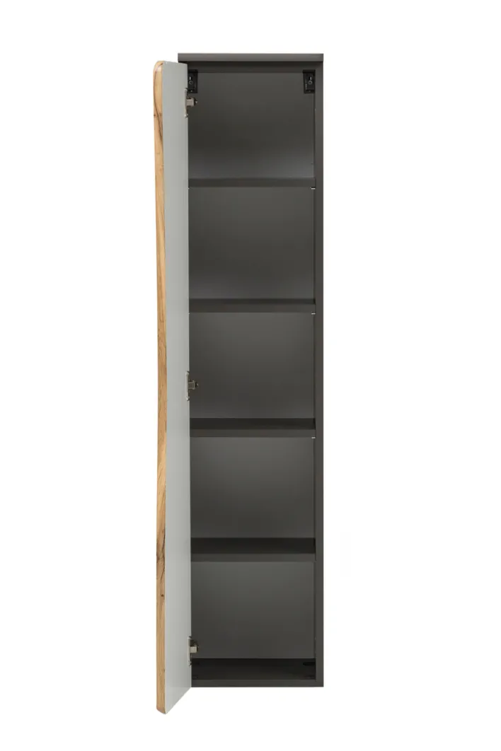 Der Bad-Midischrank ANTWERPEN braun/grau 30cm aus Wotaneiche Nachbildung sorgt für ein modernes und gleichzeitig natürliches Flair im Bad. Auffallend ist die Tür mit Baumkante, die den Schrank zum Blickfang macht.