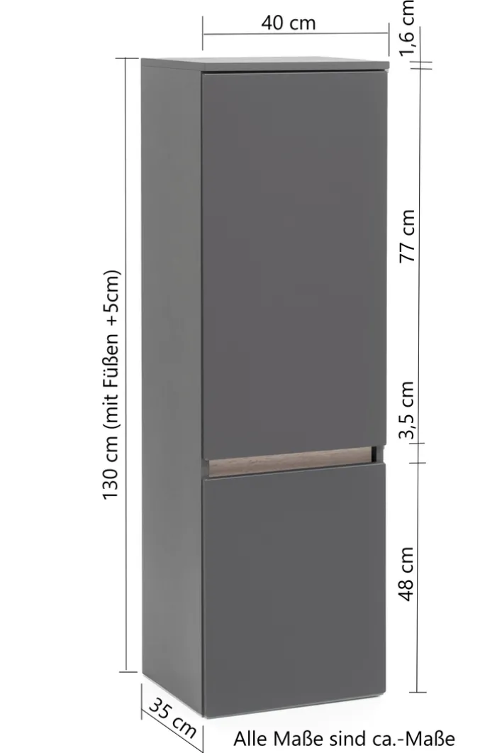Im Bad-Midischrank BRÜGGE in den attraktiven Farben Mattgrau (Front) und Graphit (Korpus) finden sämtliche Habseligkeiten Platz, die im Badezimmer benötigt werden. Das Push-to-Open-System ermöglicht einen schnellen Zugriff. Sicher auf vier Möbelfüßen stehend, bietet der Schrank mit einer Breite von 40 cm, einer Höhe von 130 cm und einer Tiefe von 30 cm ausreichend Stauraum. Die beiden Türen sind beidseitig montierbar und erlauben Flexibilität beim Aufbau. Die folierte Holznachbildung fügt sich stimmig in moderne oder klassisch gestaltete Bäder ein.