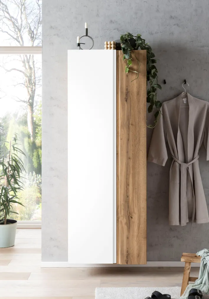 GENT ist ein 2-türiger, weiß-brauner Bad-Seitenschrank mit einer Breite von 65 cm und einer Höhe von 180 cm. Der Korpus aus Wotan Eiche Nachbildung verleiht ihm eine sehr moderne und wohnliche Note.