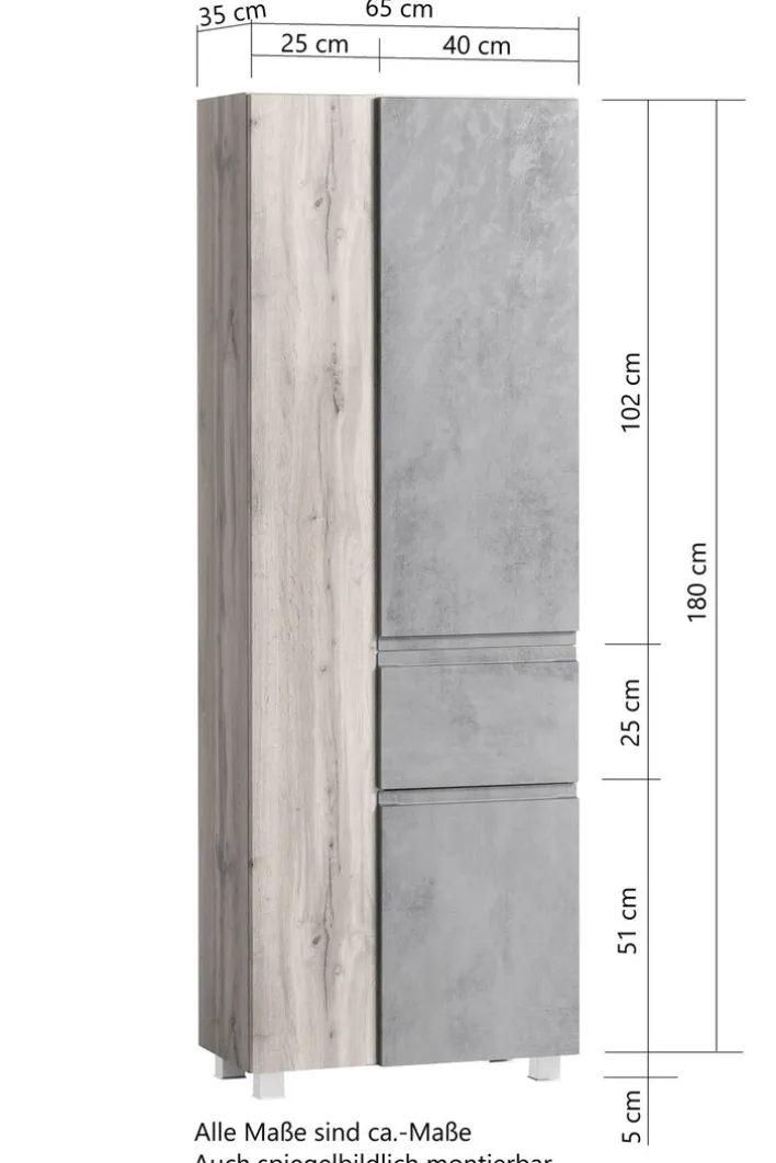 Die zwei asymmetrischen Türen lassen es vermuten: Der Bad-Hochschrank GENT bietet Aufbewahrungsfächer in verschiedener Breite. Mit acht Einlegeböden lässt sich die Höhe der Fächer variieren. Das ist ideal, um das den Stauraum zu optimieren und besonders viel unterzubringen. Gleichzeitig geben die Türen mit unterschiedlicher Breite dem Hochschrank einen modernen Look. Zu diesem Stil passt die Farbgebung in Wotaneiche-Nachbildung und Oxidbeton-Grau. Der Hochschrank lässt sich wahlweise an der Wand montieren oder auf die vier silberfarbigen Kunststofffüße stellen.
