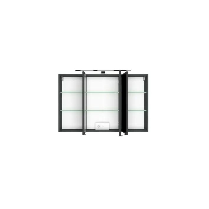 Der graue Bad-Spiegelschrank BREGENZ macht der Unordnung im Badezimmer endlich ein Ende, denn mit einer Breite von 100 cm und einer Höhe von 64 cm bietet er viel Stauraum. Geliefert wird er inklusive einer LED-Aufbauleuchte in Schwarz.