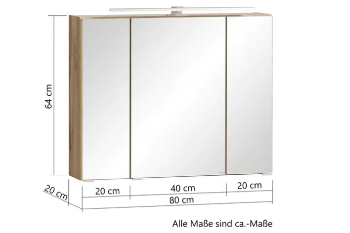 Der weiß-braune Bad-Spiegelschrank GENT ist 80 cm breit, 20 cm tief und 64 cm hoch. Ausgestattet mit einer LED-Aufbauleuchte in Edelstahloptik, punktet das Möbelstück durch viel Stauraum.