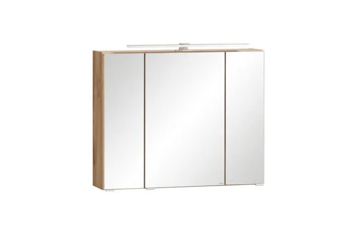 Der Bad-Spiegelschrank verfügt über drei Spiegeltüren. Im Inneren befinden sich hinter jeder Türe jeweils zwei Glaseinlegeböden für Bad-Utensilien. Diese sind höhenverstellbar. Der moderne Badschrank ist innerhalb des Korpus mit einer Steckdose sowie einem Lichtschalter ausgestattet. Hier ist es möglich, zum Beispiel einen Rasierer oder Föhn anzuschließen. Das gesamte Produkt besteht aus einer Holznachbildung. Als Dekorfarbe dient hier Eiche. Die Schrankvorderseite ist vollständig bespiegelt. Der Bad-Spiegelschrank GENT ist mit weiteren Produkten der Reihe kombinierbar.