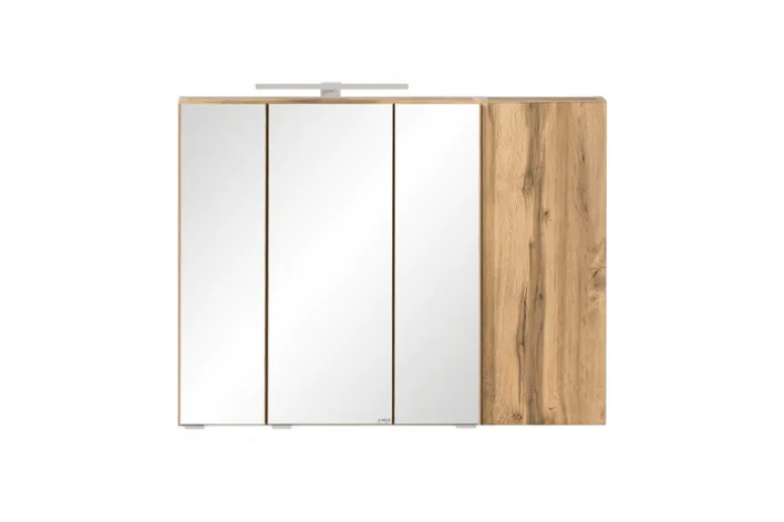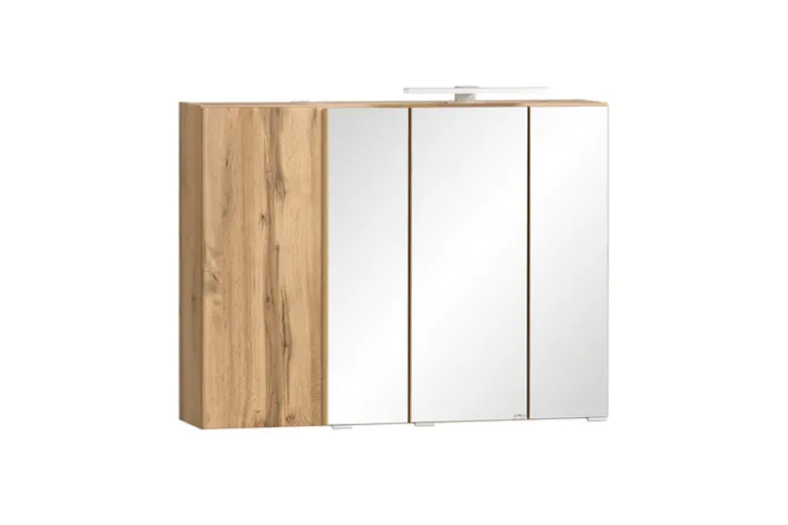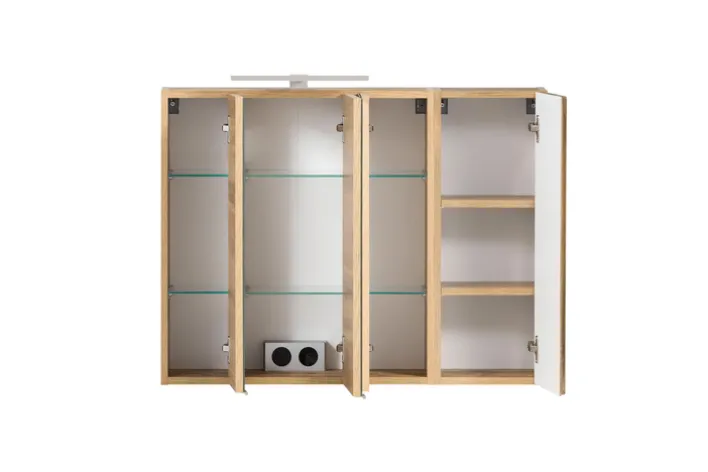 Dieser Bad-Spiegelschrank hat eine Höhe von 64 cm sowie eine Tiefe von 20 cm. Er besteht aus einer Holznachbildung, wobei der Korpus aus einer Wotaneiche-Nachbildung ist, sodass er das optische Highlight im Badezimmer darstellt. Der Schrank verfügt über vier Türen, von denen drei 3D-Spiegeltüren sind, während die vierte eine schicke MDF-Front besitzt. Als Stauraum dienen sechs Glaseinlegeböden sowie zwei Einlegeböden. Zudem ist er mit einer fest eingebauten LED-Aufbauleuchte in Edelstahloptik (380 Lumen, 6 Watt) ausgestattet.