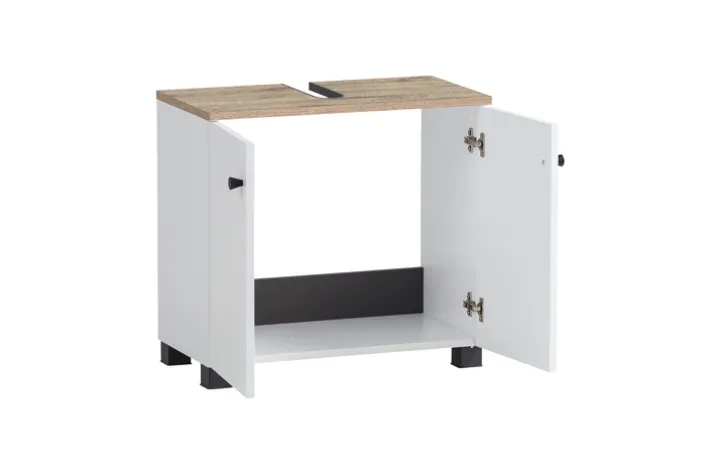 Hinter den beiden sanft schließenden Türen mit Anschlagdämpfern lassen sich im Bad-Waschbeckenunterschrank BALTO Pflegeartikel, Reinigungsmittel, Handtücher und Badutensilien ordentlich und geschützt aufbewahren. Der Oberboden in Wildeiche-Dekor setzt einen warmen Akzent und die schwarzen, matt lackierten Metallgriffe und Beschläge bilden einen modernen Kontrast. Mattschwarze Füße aus Kunststoff verleihen dem Möbelstück Stabilität und runden das stilvolle Erscheinungsbild ab. Der integrierte Siphonausschnitt ermöglicht eine einfache Montage unter dem Waschbecken.