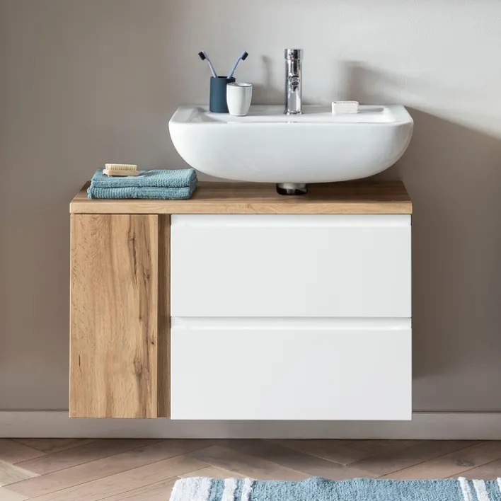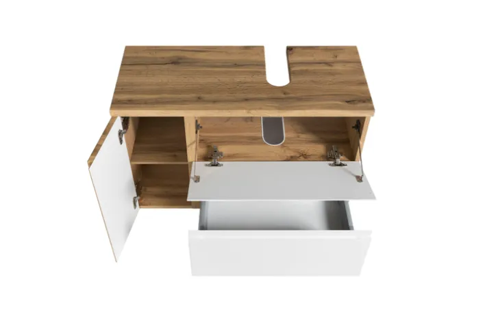 Der Bad-Waschbeckenunterschrank GENT aus solider Holznachbildung hat eine Größe von 85 x 54 x 35 cm. Seinen Korpus in Wotaneiche kombiniert er mit grifflosen Fronten in mattem Weiß, die für eine stylische Optik sorgen. Hinter einer Klappe und einer Tür bietet der Waschbeckenunterschrank viel Platz für Handtücher, Reinigungsprodukte & Co. Im Schubkasten finden hingegen Kleinutensilien einen sicheren Platz. Die Abdeckplatte ist mit einem Siphonausschnitt versehen, der die Installation des Waschbeckens deutlich erleichtert.