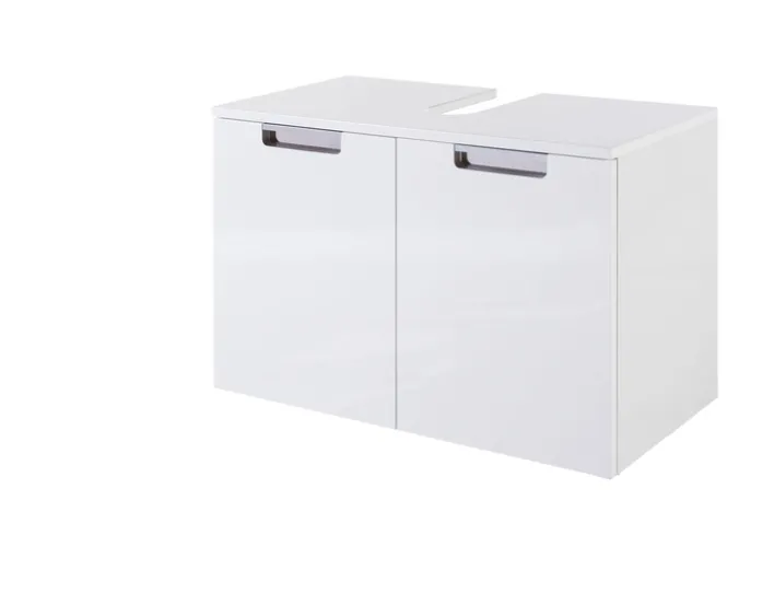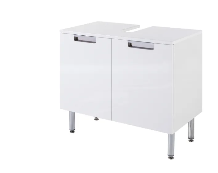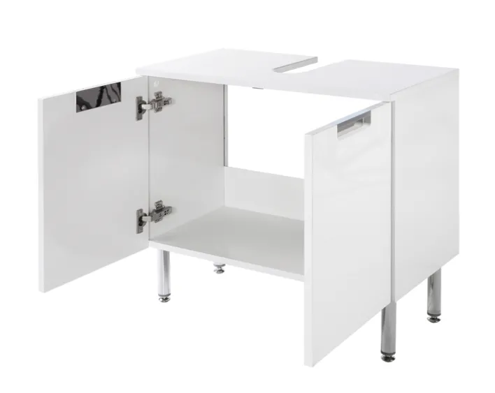 Der Unterschrank ist mit zwei Türen ausgestattet, die über eine Soft-Close-Funktion verfügen, was ein geräuschloses Schließen ermöglicht. Die silberfarbenen Griffe und die stabilen, verchromten Füße ergänzen das moderne Erscheinungsbild und sorgen für zusätzliche Stabilität. Dieser Waschbeckenunterschrank ist nicht nur funktional, sondern auch ein stilvolles Element für jedes Badezimmer.