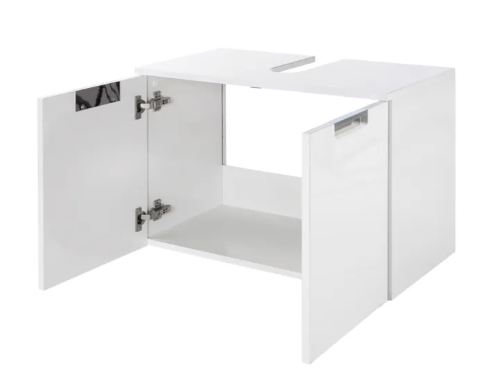 Der Waschbeckenunterschrank präsentiert sich in einem modernen Design und ist in einem eleganten Weiß gehalten. Die klaren Linien und die glatte Oberfläche aus Holznachbildung verleihen dem Möbelstück eine zeitgemäße Ästhetik, die sich nahtlos in verschiedene Badezimmerstile einfügt. Mit einer Breite von 65 cm, einer Höhe von 46,5 cm und einer Tiefe von 35 cm bietet der Schrank ausreichend Stauraum für diverse Badutensilien.