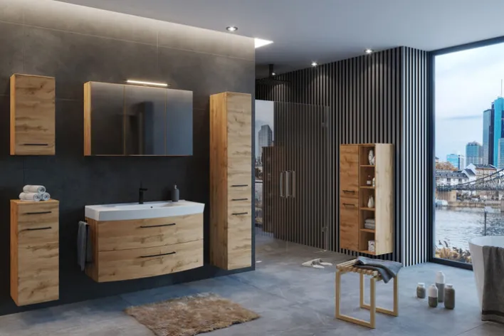 Doppelt schön, und das in jeder Hinsicht! Die naturfarbene Holznachbildung in Wotaneiche wird durch schwarze Metallgriffe gekonnt in Szene gesetzt. Auch der Kontrast der offenen Fächer zu den beiden Türen ist ebenso praktisch wie dekorativ. Auf den Einlegeböden findet die wichtigsten Badutensilien ihren Platz. Besonders gefällt zudem, dass der Midischrank aus der vielseitigen Badserie LIMBURG gestellt oder gehängt werden kann. Er wird zerlegt geliefert, bitte Montageanleitung und Pflegehinweise am Artikel beachten.