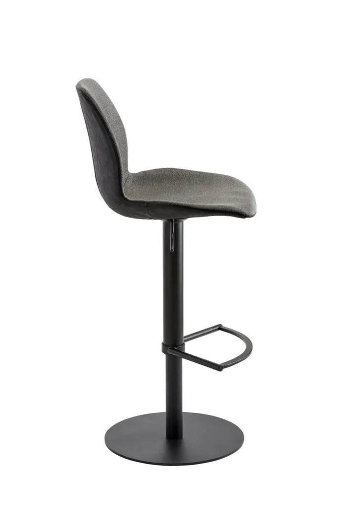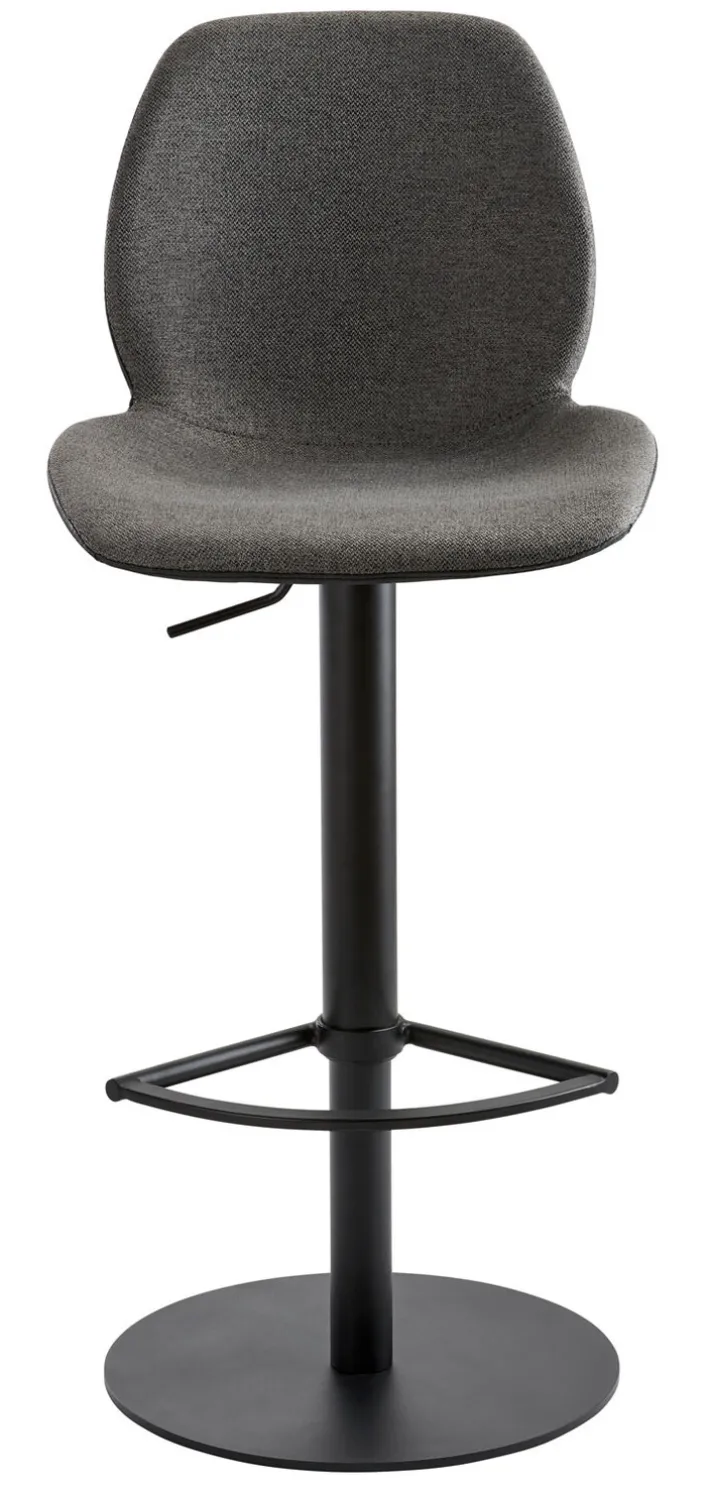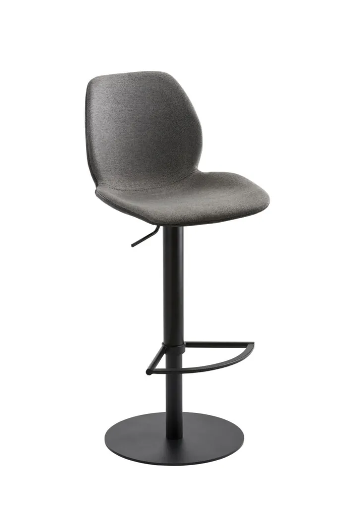 Schwarz koloriert und aus hochwertigem Stahl angefertigt, präsentiert sich das Gestell des Barhockers MYMARCO. Es ist drehbar ausgeführt, ruht auf einem runden Bodenteller, bietet eine ansprechend designte Fußstütze an und stellt einen Sicherheitslift zur stufenlosen Höhenverstellung in Option. Der Lift ermöglicht variable Sitzhöhen im Bereich von 84,5 und 109,5 Zentimeter. Das Stahlgestell gibt einer ergonomisch geformten Sitzschale festen Halt und ermöglicht Drehungen um 360 Grad. Sitz und Rücken sind mit bequemen Polstern versehen und auf der Innenseite mit meliertem Stoff in Schwarz und Anthrazit bezogen. Außen ist die Sitzschale mit schwarzen Kunstleder bekleidet. Mit bis zu 120 kg getesteter Belastbarkeit setzt sich der Barhocker MYMARCO als robustes und langlebiges Möbelstück in Szene.
