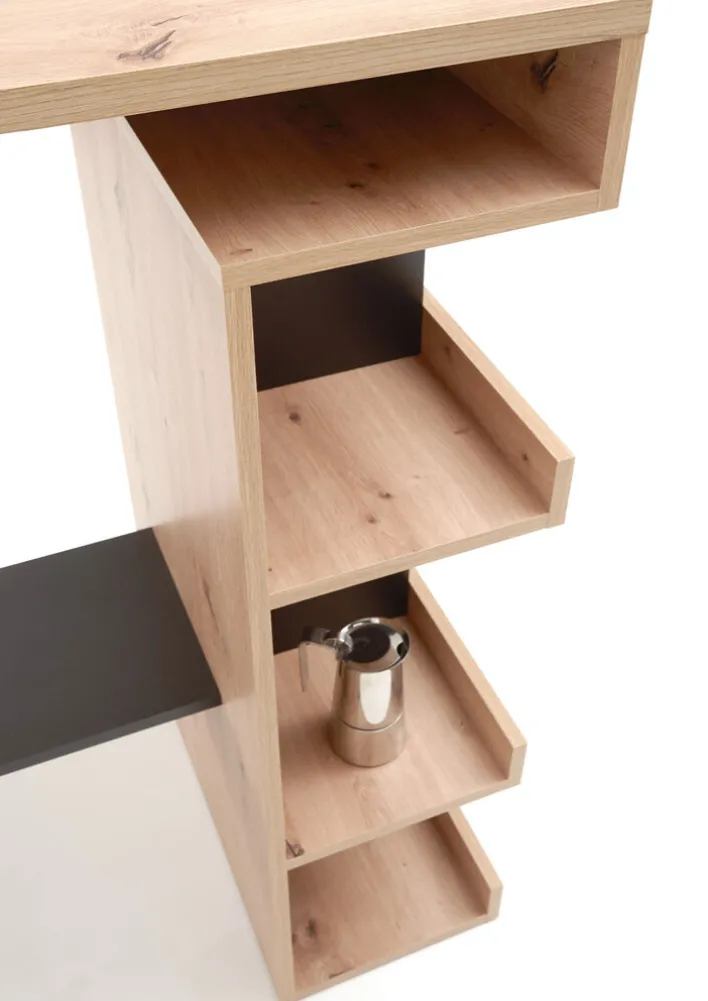 Der Bartisch SMASH mit den Maßen 50 x 103 x 108 cm kombiniert braune Holznachbildung mit massivem Eichenholz und ist mit maximal 40 kg belastbar. Mit seiner stilvollen Artisan Eiche Optik ist der Bartisch eine schöne Ergänzung für Küche. Wohn- und Essbereich und lässt sich vielseitig kombinieren. Sogar als Raumteiler zwischen Kühe und Wohnbereich kann der Bartisch verwendet werden. Der Bartisch mit einer großen Ablage ist zusätzlich mit einem seitlichen Regal ausgestattet. das viel Platz bietet.