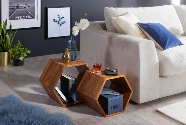 Die sechseckigen Beistelltische in der Form einer Honigwabe kommen in zwei Größen in den Wohnraum. Dank der Verwendung von massivem Sheeshamholz sind sie robust und lassen sich mit einem Gewicht von maximal 5 kg belasten. Das Holz ist in Honigfarbe gebeizt und strahlt dadurch Wärme und Natürlichkeit aus. Dadurch erhält auch der Wohnraum ein gemütliches Ambiente. Zusätzlich zum spannenden Design überzeugen die Beistelltische mit je zwei kleinen Ablagen.