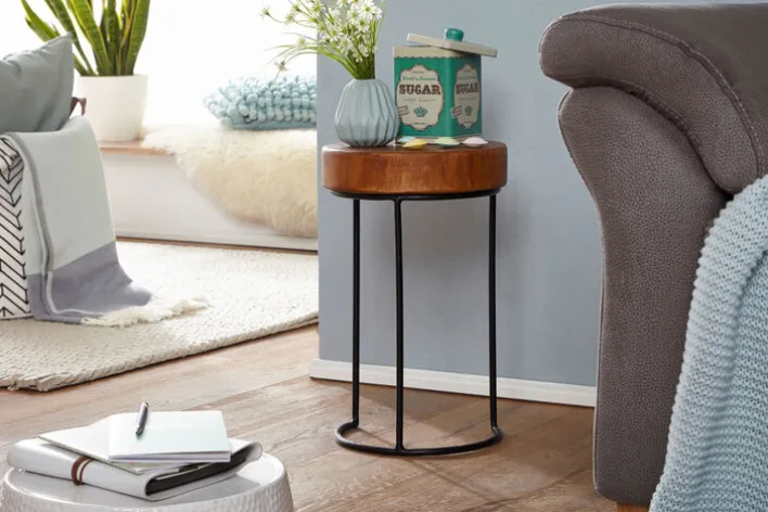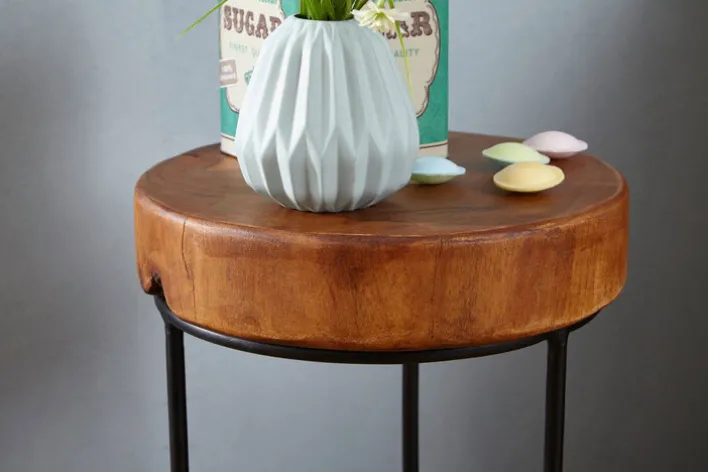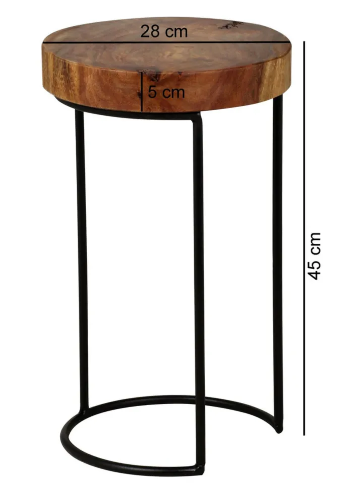 Der runde, 28 x 45 cm große Beistelltisch Sheesham ist ein auffälliges Schmuckstück, das jeden Wohnraum ziert. Wenngleich er als praktische Ablage dient, setzt er sich auch als Solokünstler perfekt in Szene.