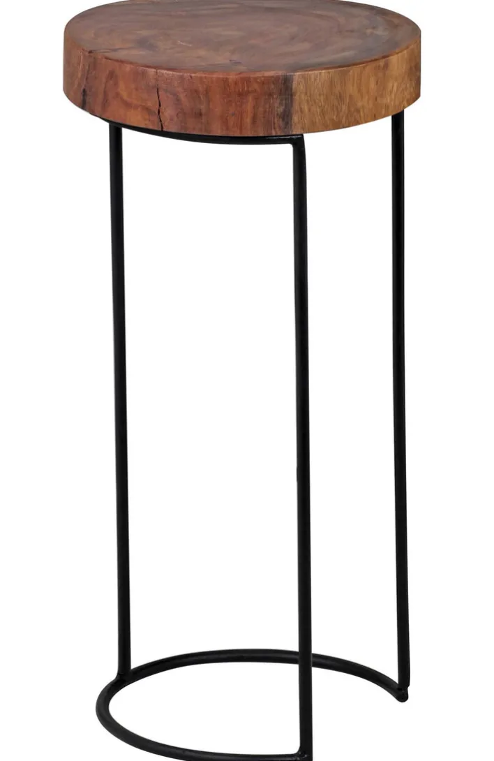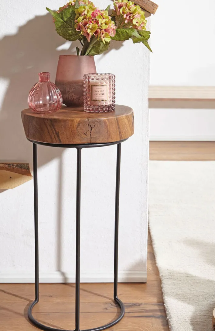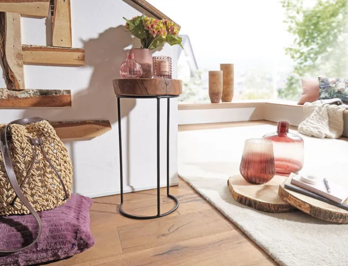 Dieser Tisch in runder Form ist ein absoluter Blickfang in jedem Raum, was auch damit zusammenhängt, dass er über einen interessanten farblichen Kontrast verfügt. Denn während die Tischplatte aus massivem Sheesham-Holz in Braun besteht, ist das Kufengestell aus Metall in einem matten Schwarz gehalten. Somit ist der Beistelltisch für sich alleine schon ein Deko-Artikel, doch bietet er zudem noch Platz, um auf ihm diverse Accessoires wie etwa Blumen oder eine kleine Lampe zu platzieren.