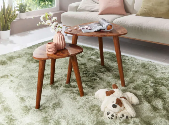 Zum Beistelltisch Set gehören 2 Tische aus massivem Rosenholz. Die natürliche Maserung des hochwertigen Rohstoffs verleiht den Kleinmöbeln eine besonders angenehme Optik. Die beiden Tische lockern ein gemütliches Ambiente optisch auf und können auf Wunsch mit Wohnaccessoires ansprechend dekoriert werden. Auch als Ablagefläche für Lesestoff oder elektronische Geräte sind sie geeignet.