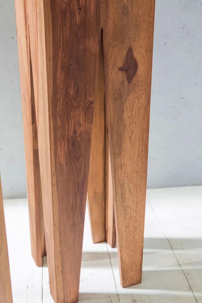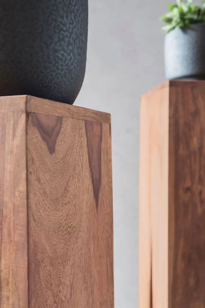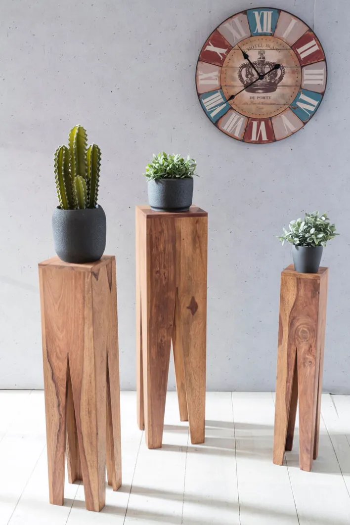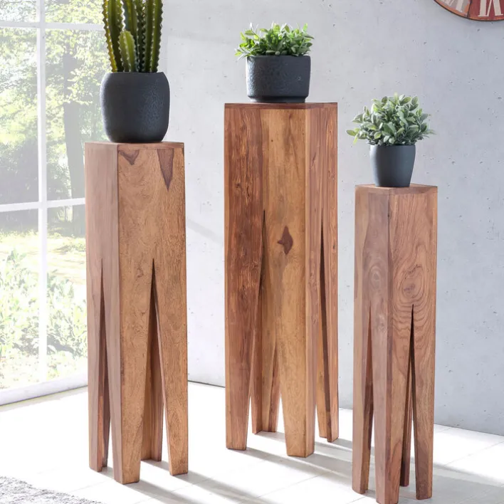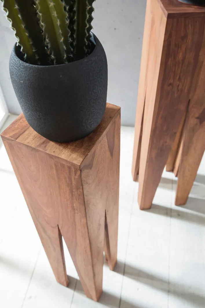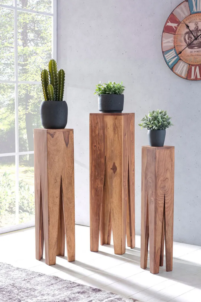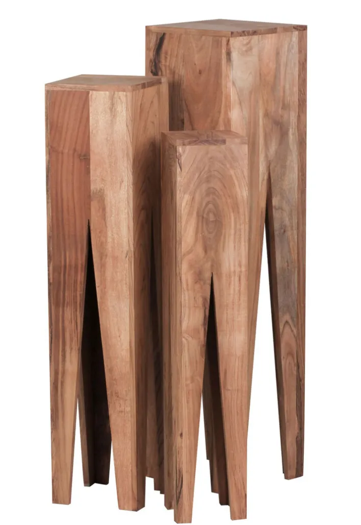 Die Beistelltische bestehen aus Akazienholz und sind in aufwändiger Handarbeit gefertigt. Sie haben eine Größe von 25 x 100 x 25 cm, 20 x 90 x 20 cm sowie 15 x 80 x 15 cm und lassen sich kombiniert aufstellen oder einzeln in verschiedenen Wohnräumen platzieren. Ihr extravagantes Design macht die Beistelltische an jedem Standort zu einem Highlight. Auch einsetzen lassen sich die Beistelltische flexibel, denn sie machen als Ablage ebenso eine gute Figur wie als Pflanzenhocker.