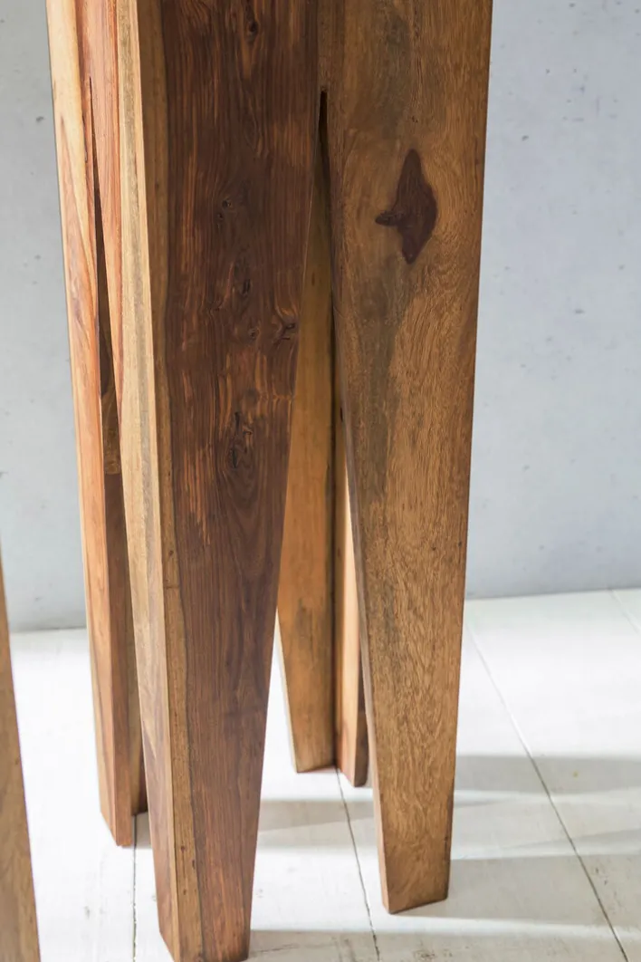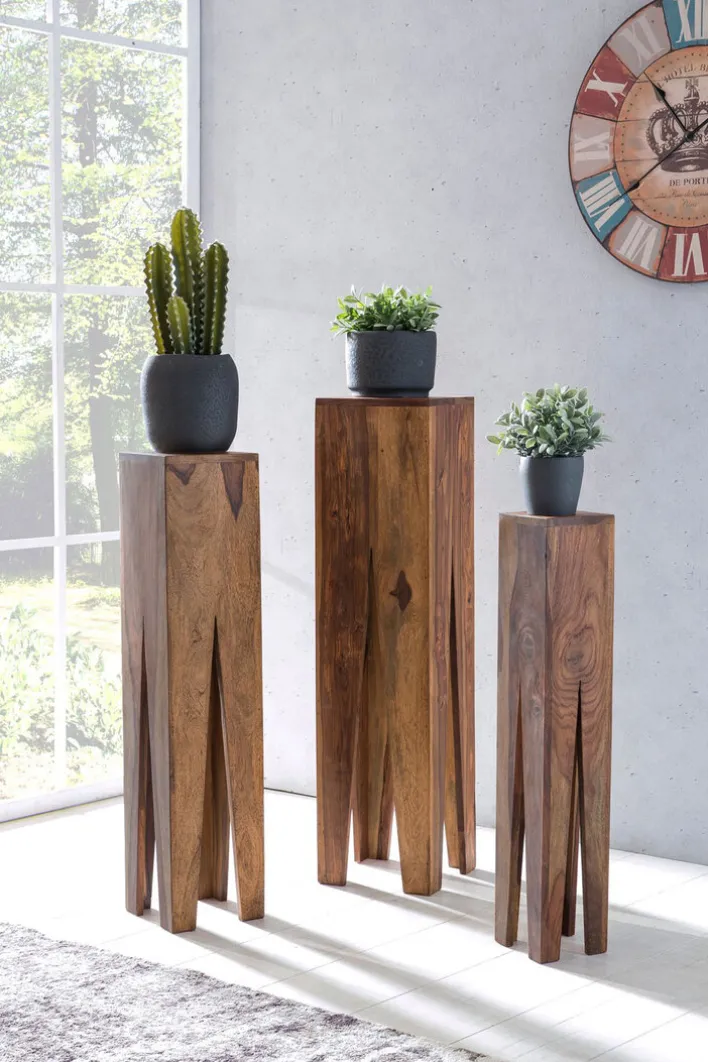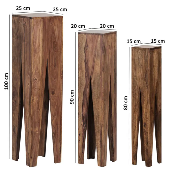 Der erste Tisch des Sets aus massivem Sheesham-Holz hat die Maße 25 x 25 x 100 cm, während der zweite die Maße 20 x 20 x 90 cm aufweist und die Maße des dritten 15 x 15 x 80 cm betragen. Alle drei Tische haben ein Vierfußgestell und sind schon für sich wunderschöne Dekorationen in etwa dem Wohnzimmer oder dem Flur, doch können sie selbstverständlich auch mit Accessoires bestückt werden, wodurch sie eine persönliche Note bekommen.