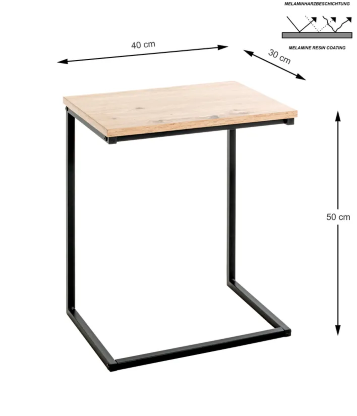 Der kleine Tisch aus Metall und Holznachbildung sowie Kunststoff kann bis zu acht Kilogramm belastet werden. Das Modell selbst wiegt nur 2,3 Kilogramm. Das Metallgestell verläuft wie ein Rahmen vom Boden zur Tischplatte. Dieses Gestell ist zu einer Seite offen konzipiert, sodass sich der Beistelltisch mühelos näher an die Sitzfläche von Sofa und Sessel ziehen lässt. Die Melaminharzbeschichtung der Platte ist pflegeleicht.