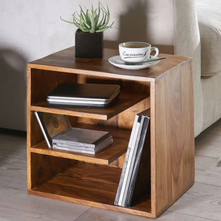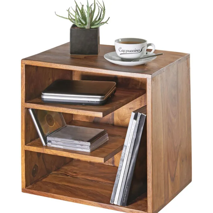Der Beistelltisch ist aus massivem Rosenholz gefertigt, die Oberfläche wurde gebeizt. Farbton und Maserung verleihen dem aus Indien stammenden Möbelstück eine warme und wohnliche Ausstrahlung. Der Beistelltisch kann in der Nähe einer Wand oder mit dem Rücken zum Sofa platziert werden. Er kommt aber auch frei im Raum stehend gut zur Geltung.