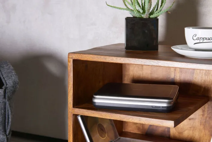 Der Beistelltisch kann auch als dekoratives Aufbewahrungsmöbel genutzt werden: Unterhalb der Ablagefläche ist das 43 cm hohe und 43 cm breite Wangengestell mit zwei Platten ausgestattet, die verschiedene Möglichkeiten zum Platzieren von Büchern oder Zeitschriften, Unterhaltungsmedien oder dekorativen Wohnaccessoires bieten. Auch kleine Leckereien zum Naschen zwischendurch sind hier gut aufgehoben.