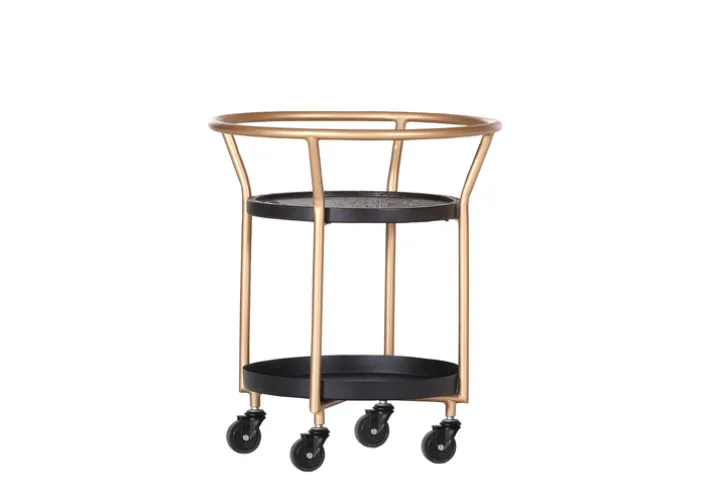 Der Tisch besteht aus massivem Akazienholz, das schwarz gebeizt und lackiert ist, und einem stabilen Metallgestell in Goldoptik. Diese Kombination verleiht dem Tisch eine elegante und zugleich robuste Ausstrahlung. Besonders hervorzuheben sind die zwei Ablageflächen, die zusätzlichen Stauraum bieten.