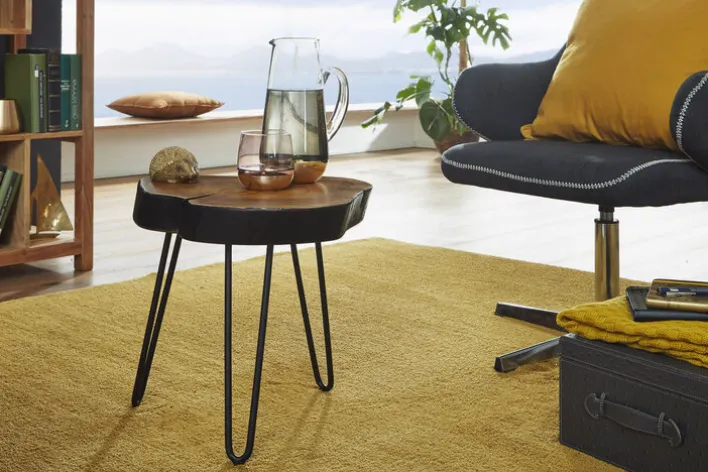 Der Beistelltisch BAGLI steht auf einem Dreifußgestell aus schwarzem Metall, das einen geschmackvollen Kontrast zu der warm wirkenden Holzoberfläche darstellt. Das außergewöhnliche Möbelstück passt gut in Einrichtungen im Landhausstil, kann aber auch in modern gestalteten Umgebungen gut zur Geltung kommen.