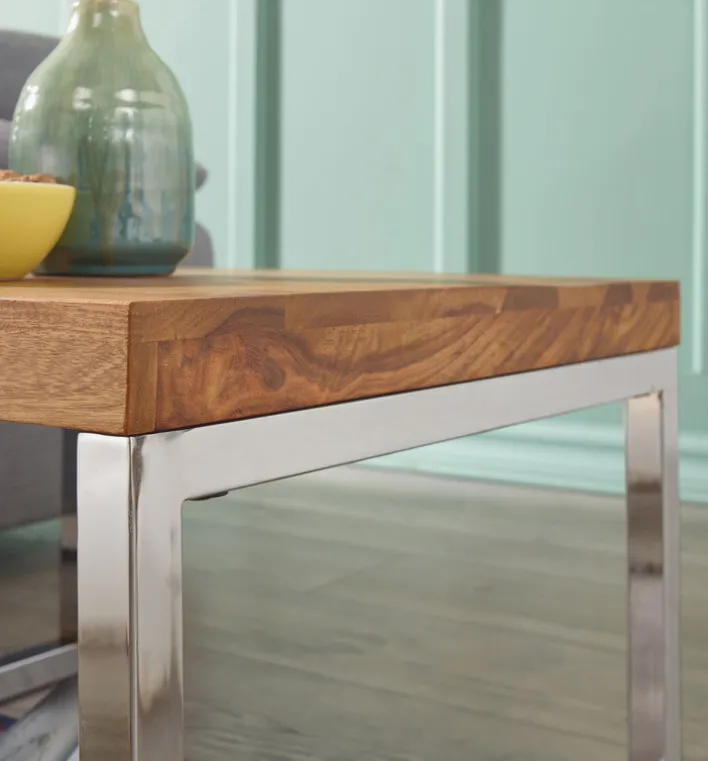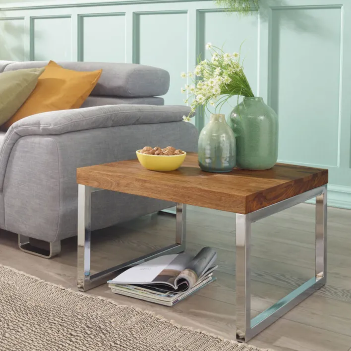 Mit dem 60 x 60 cm großen Beistelltisch GUNA in der Farbkombination Chromfarbig/ Sheesham zieht ein optisches Highlight in das Wohnzimmer ein.