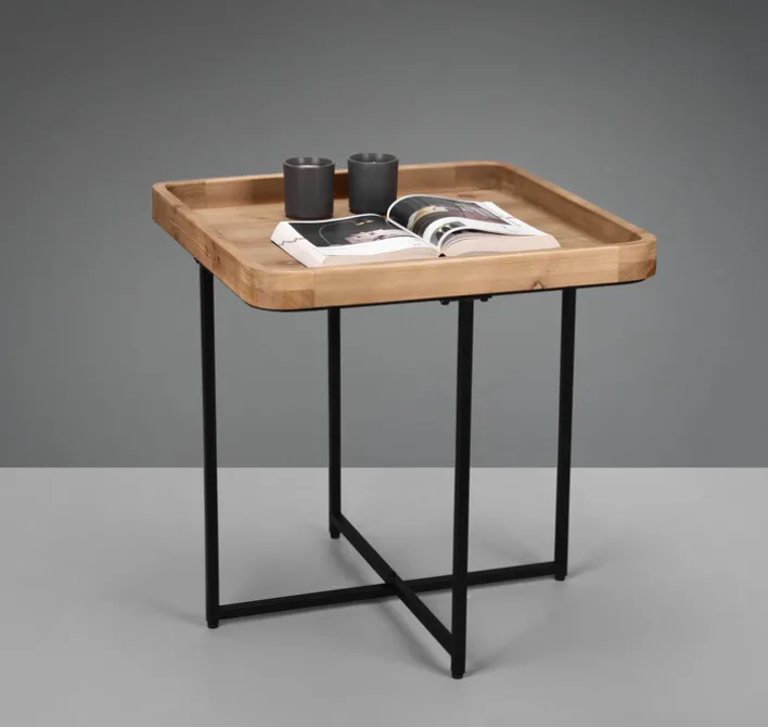 Der Beistelltisch JENNY ist quadratisch und misst in Länge und Breite 57 x 57 cm. Er zeigt die Farben Braun und Schwarz. So besteht sein Kufengestell aus schwarzem Metall, die Tischplatte aus braunem Holz. Die Höhe des Tisches liegt bei 59 cm.