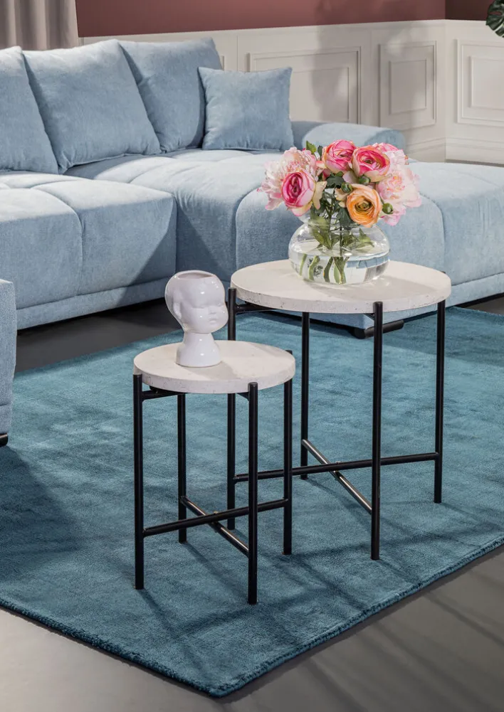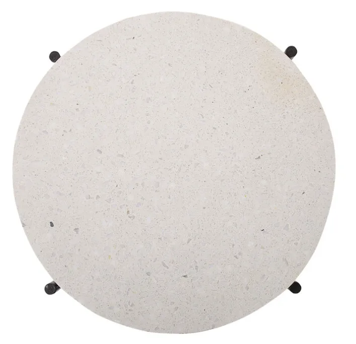 Der Beistelltisch aus der Serie MAXIMUS präsentiert sich mit einer runden Tischplatte aus weiß-grau meliertem Terrazzo-Stein. Die Oberfläche zeigt eine charakteristische Terrazzo-Struktur mit feinen Einschlüssen, die dem Tisch eine dezente, moderne Optik verleihen. Die Maße betragen 48 cm im Durchmesser sowie 50 cm in der Höhe, wodurch der Tisch vielseitig im Wohnbereich eingesetzt werden kann.