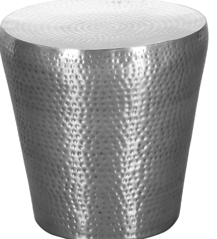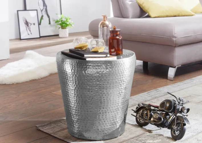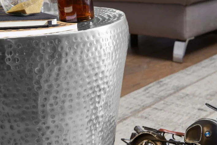 Dank des silberfarbigen Beistelltischs liegt alles immer in Reichweite, sei es eine Zeitung, ein Glas oder eine Vase. Aufgrund seiner außergewöhnlichen Hammerschlag-Optik verfügt der Tisch über eine Oberfläche, die zum Befühlen einlädt. Ein weiterer Pluspunkt des Tischs ist seine große Stabilität. So schnell wirft den Aluminium-Tisch nichts aus der Bahn. Sollte doch einmal ein Glas umkippen, ist das kein Problem, denn mit einem Lappen lässt sich der Beistelltisch problemlos abwaschen.