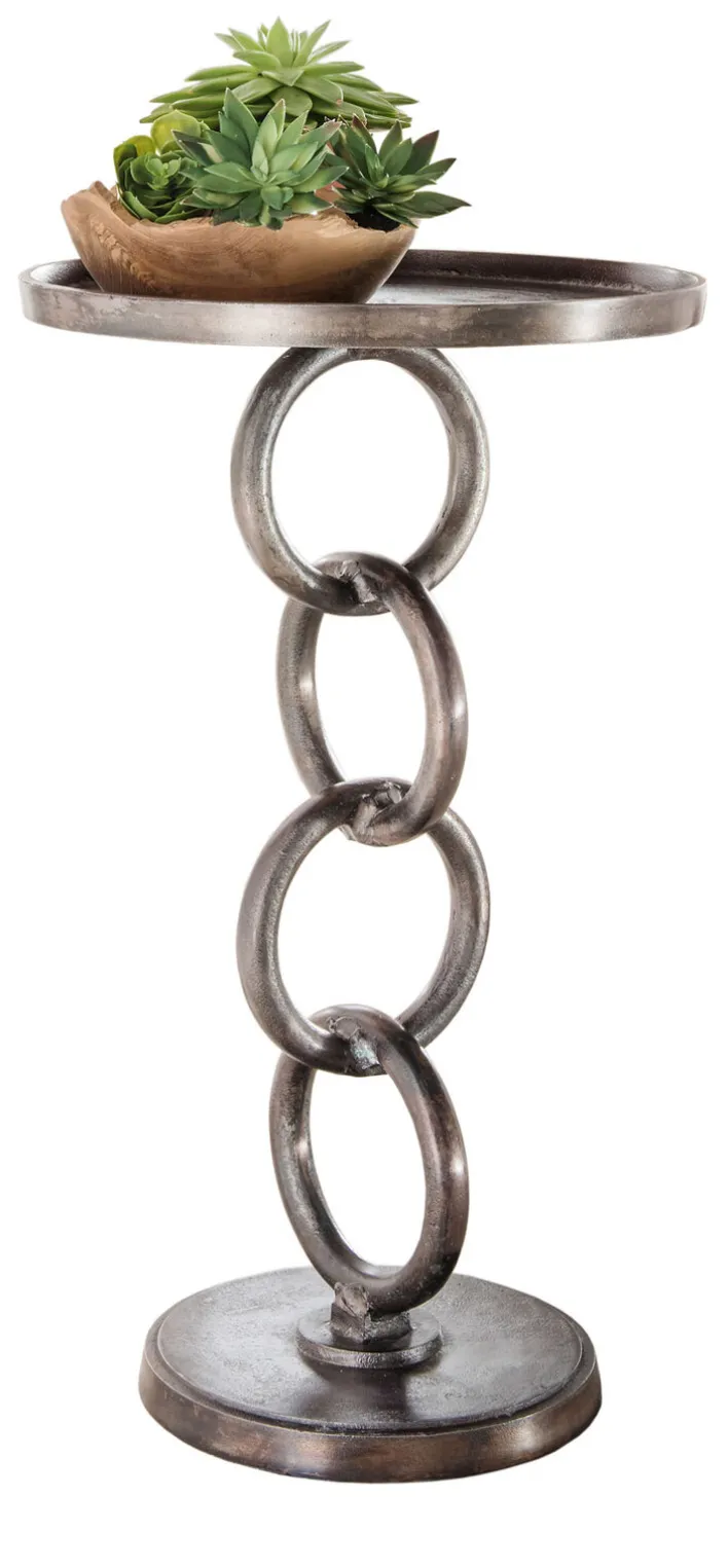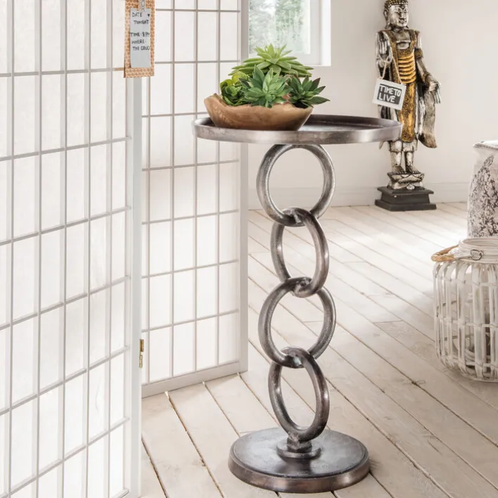 In Flur, Ess- oder Wohnzimmer zieht der aparte Beistelltisch CIRKLE mühelos alle Blicke auf sich. Was wie bewegliche Glieder einer großen Kette wirkt, ist in Wahrheit aus verzinntem Aluminium gefertigt. Fast schwerelos scheint auf dieser Kette die kreisrunde Ablagefläche mit einem Durchmesser von 40 cm zu ruhen.