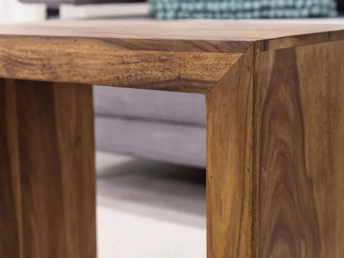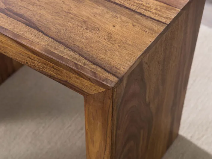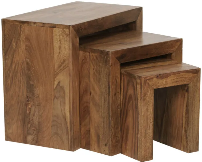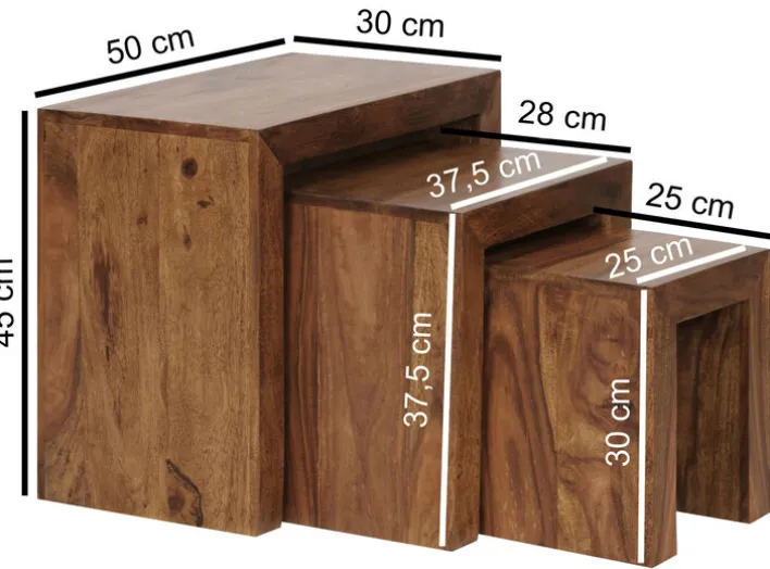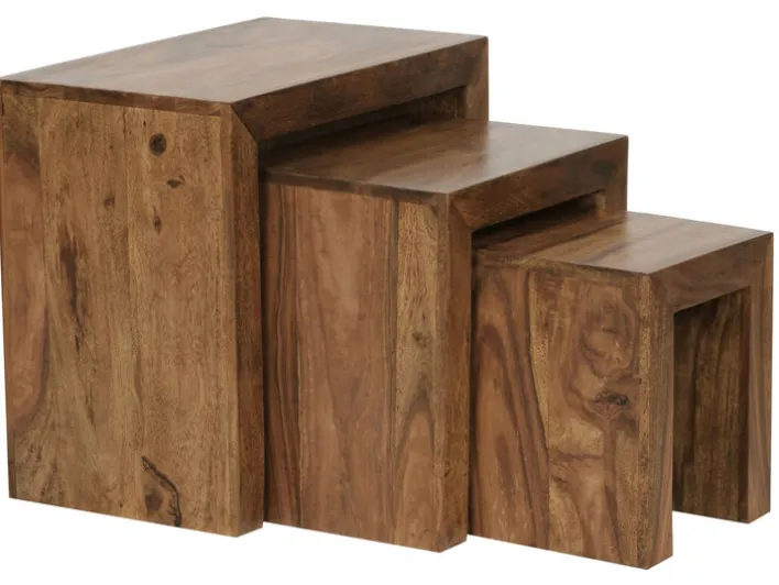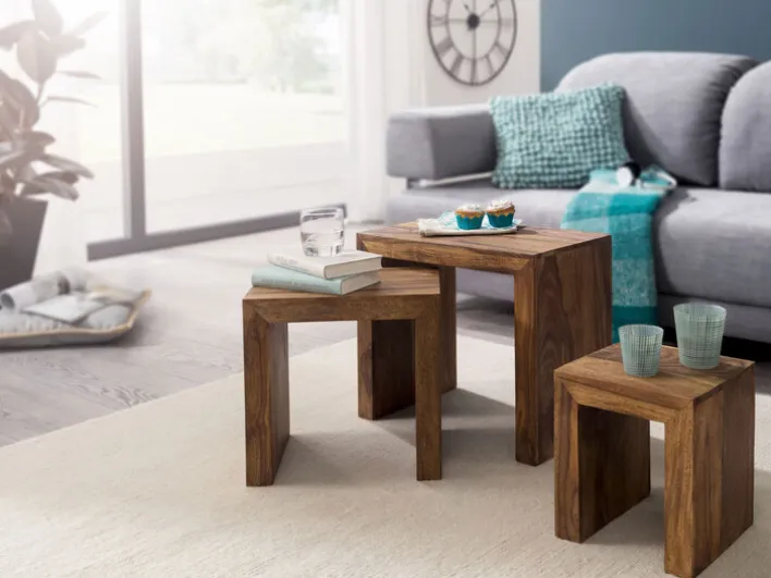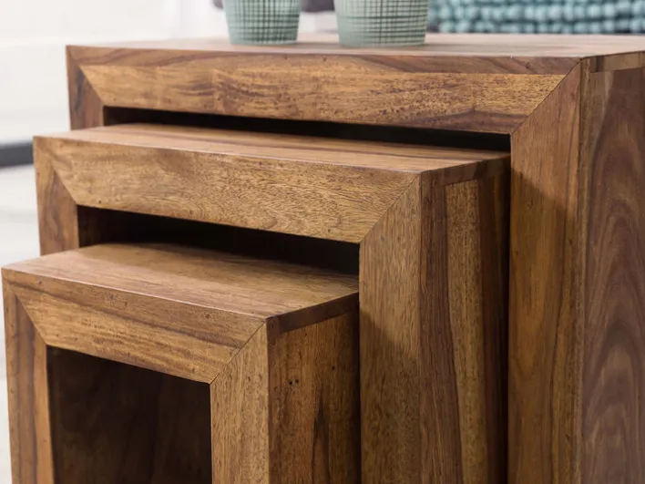 Der Beistelltisch MUMBAI ist aus Sheesham massiv gefertigt und kommt als attraktives 3-teiliger Set daher. Mit seiner gebeizten Oberfläche verleiht das Set dem Interieur eine stilvolle Note. Es wirkt ausgesprochen natürlich und wird dem Wunsch zum naturnahen Wohnen hervorragend gerecht. Ein großer Vorteil dieses Sets ist, dass sich alle drei Beistelltische zusammenschieben lassen. So geht kein wertvoller Platz im Wohnraum verloren und die Tische können je nach Bedarf zum Einsatz kommen.