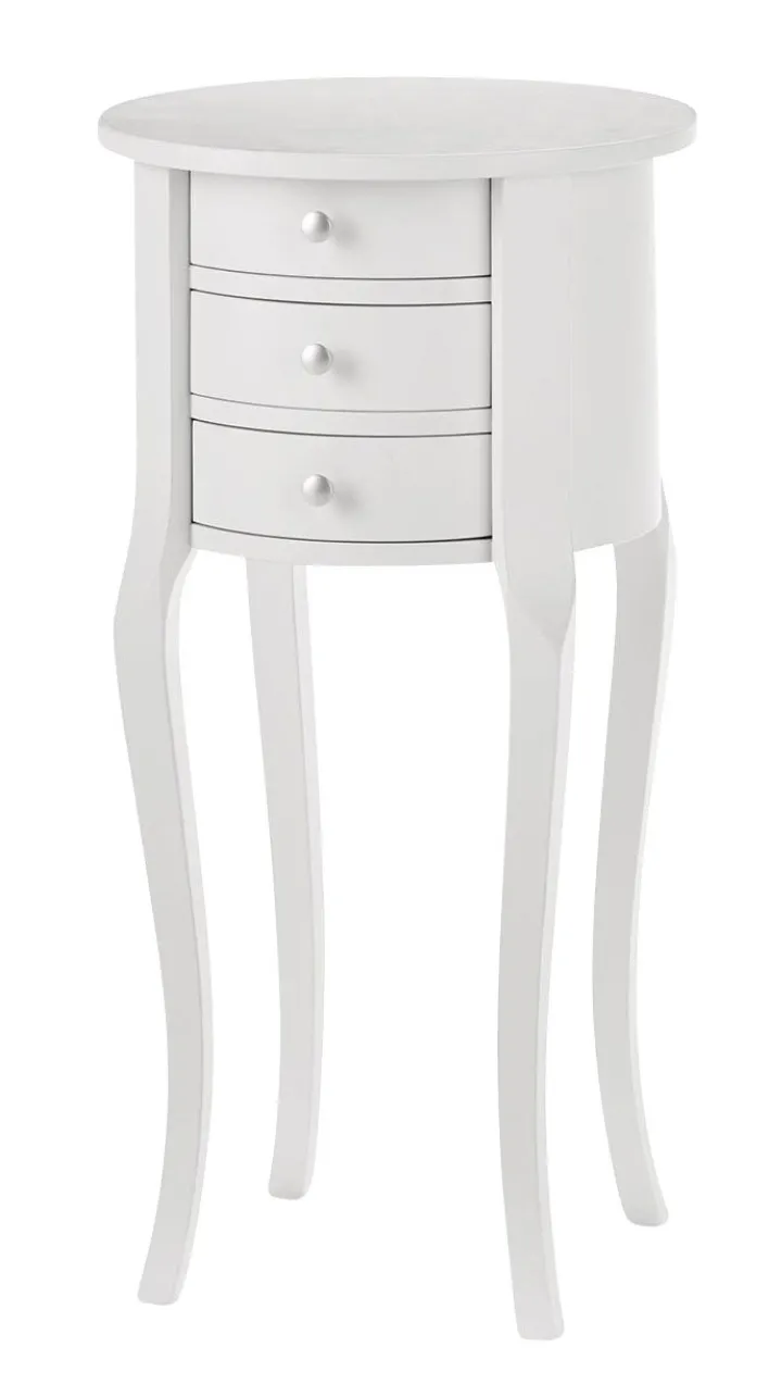 Als elegantes Kleinod voller nostalgischem Zauber zeigt sich der Beistelltisch VISTA. Er ist wie gemacht dafür, um Utensilien, ein Buch, eine Brille oder das Handy rasch abzulegen. Das hübsche Möbelteil besteht aus weiß lackiertem Massivholz, hat eine runde Platte und drei kleine Schubkästen mit weißem Knopf. Einen besonderen Charme geben ihm die elegant geschwungenen Beine.