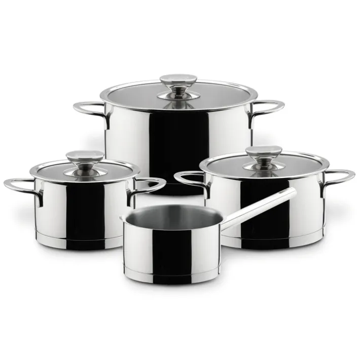Das 4-teilig Set überzeugt beim täglichen Kochen in jedem Privathaushalt mit drei Töpfen, die einen Glasdeckel haben, sowie einem praktischen Stieltopf ohne Deckel. Wenn die Zutaten im Topf kochen, gelingt jederzeit der Blick durch den Glasdeckel auf den Zustand der Lebensmittel. Die rostfreien und leicht zu reinigenden Modelle sind für alle Herdarten inklusive der hochmodernen Induktionsherde. Im Küchenregal faszinieren die Töpfe als dekorativer Anblick.
