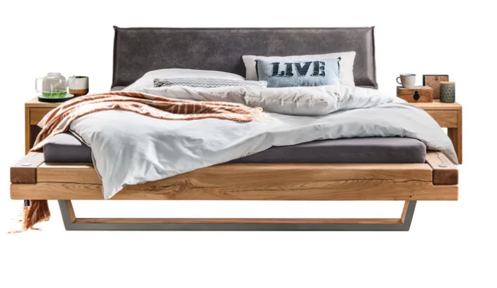 Die Maße des Bettes betragen 204 cm in der Breite, 87,5 cm in der Höhe und 224 cm in der Länge, was es zu einem imposanten Möbelstück im Schlafzimmer macht. Das Kopfteil ist mit einem weichen, grauen Stoff bezogen, der einen angenehmen Kontrast zum Holzrahmen bildet und zusätzlichen Komfort bietet. Die stabile Metallbasis sorgt für eine solide Standfestigkeit und unterstreicht das moderne Design. Dieses Bett ist die ideale Wahl für alle, die Wert auf Qualität und stilvolles Design legen.
