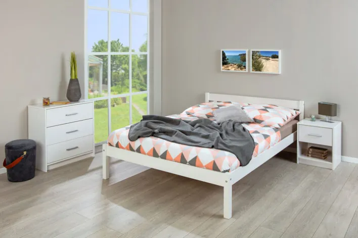 Das in elegantem Weiß gestaltete Bett LAURI verfügt über eine 140 x 200 cm große Liegefläche und wird ohne Lattenrost und Matratze geliefert.