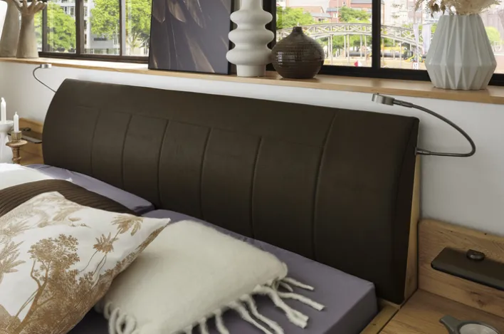 Farbe: BraunFarbton: Bianco Eiche teilmassiv/ Kopfteil Lederlook MoccaHauptfarbe: Braun