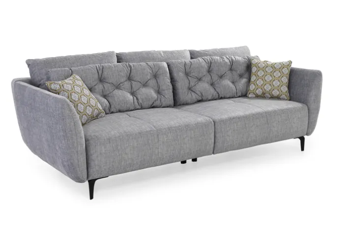 Das geräumige Bigsofa CHASE hat eine Größe von 251 x 90 x 110 cm und kommt mit fünf kuscheligen Rückenpolstern und zwei Wende-Zierkissen in das Wohnzimmer. Dank Nosag-Wellenfederung bietet das Sofa einen hohen Sitz- und Liegekomfort, während der graue Stoffbezug und die schwarzen Metallfüße für eine elegante Optik sorgt. Da das Bigsofa auch am Rücken mit Echtstoff bezogen ist, sieht es auch in der Mitte des Raumes stilvoll aus.