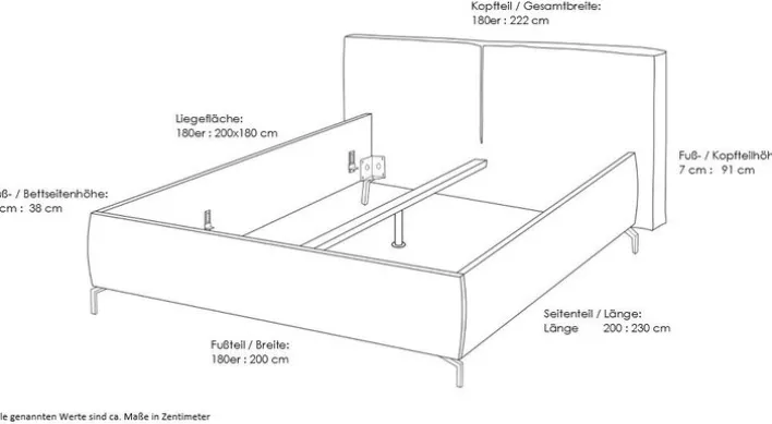 Breite: 222 cmHöhe: 31 cmLänge: 230 cmGewicht: 97,00 kgLiegefläche: 180 x 200 cmHöhe Kopfteil: 91 cm