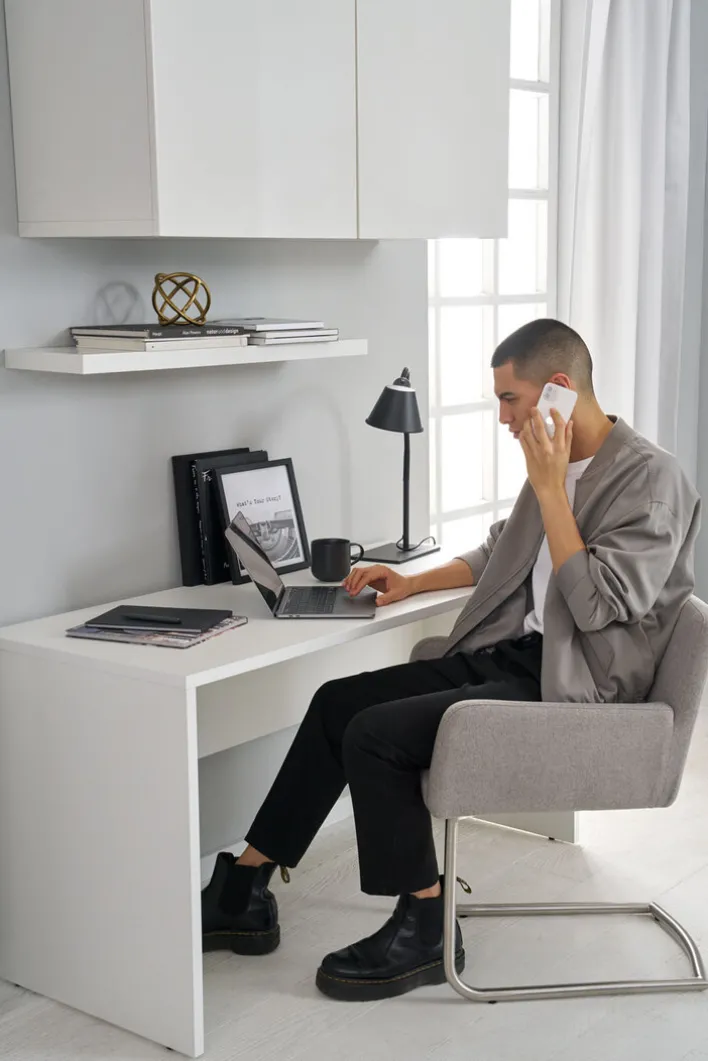 Die formschöne Arbeitsplatzleuchte lässt sich bequem mithilfe des am Gehäuse der Fassung befindlichen Schalters ein- und ausschalten. Die flexibel verstellbare Tischleuchte kann bis zu einer Tiefe von 40 Zentimetern erweitert werden. Das Modell wiegt 2,7 Kilogramm und überzeugt daher mit einer hohen Standsicherheit. Die Bürolampe mit der Schutzklasse 2 und der Schutzart IP20 wird ohne Leuchtmittel geliefert.