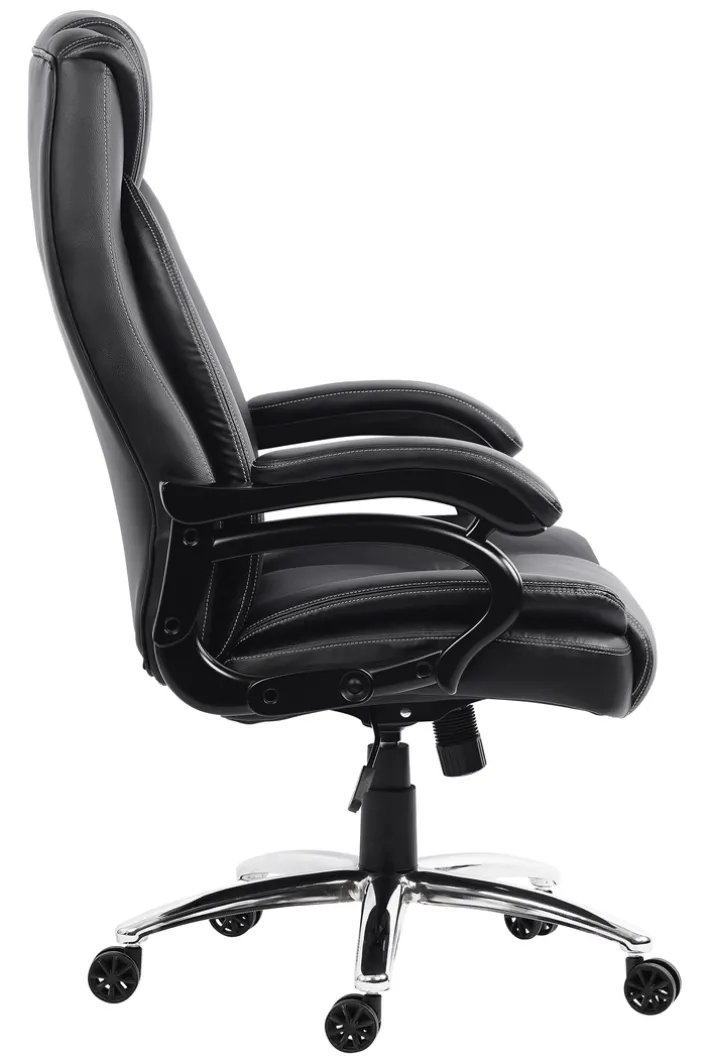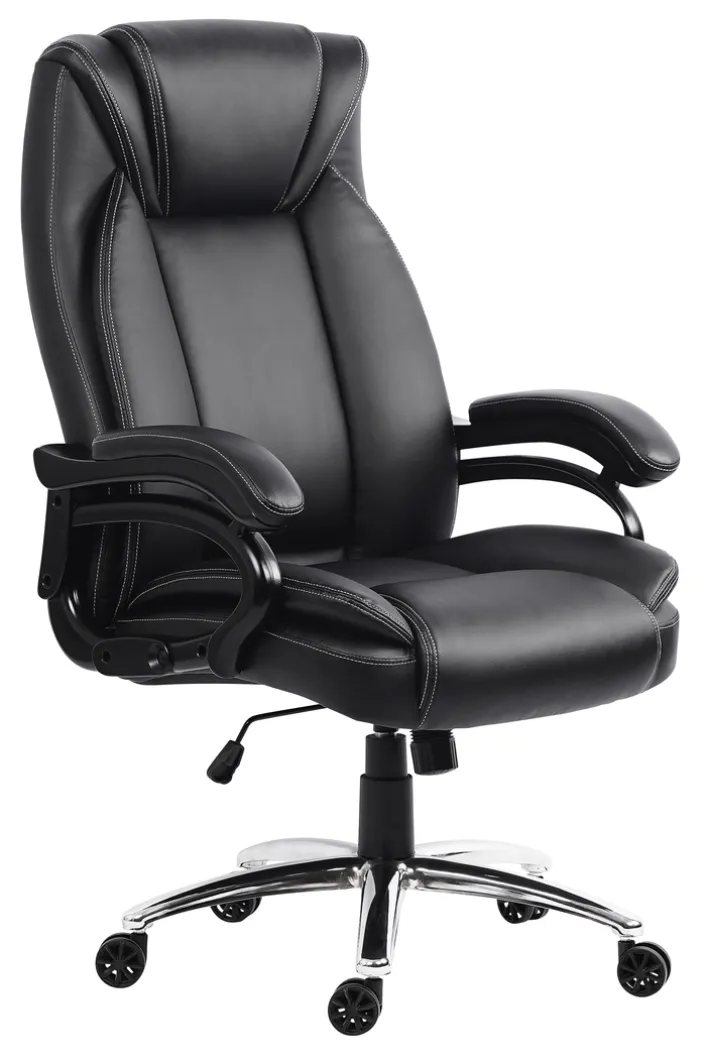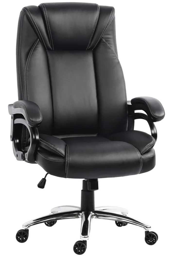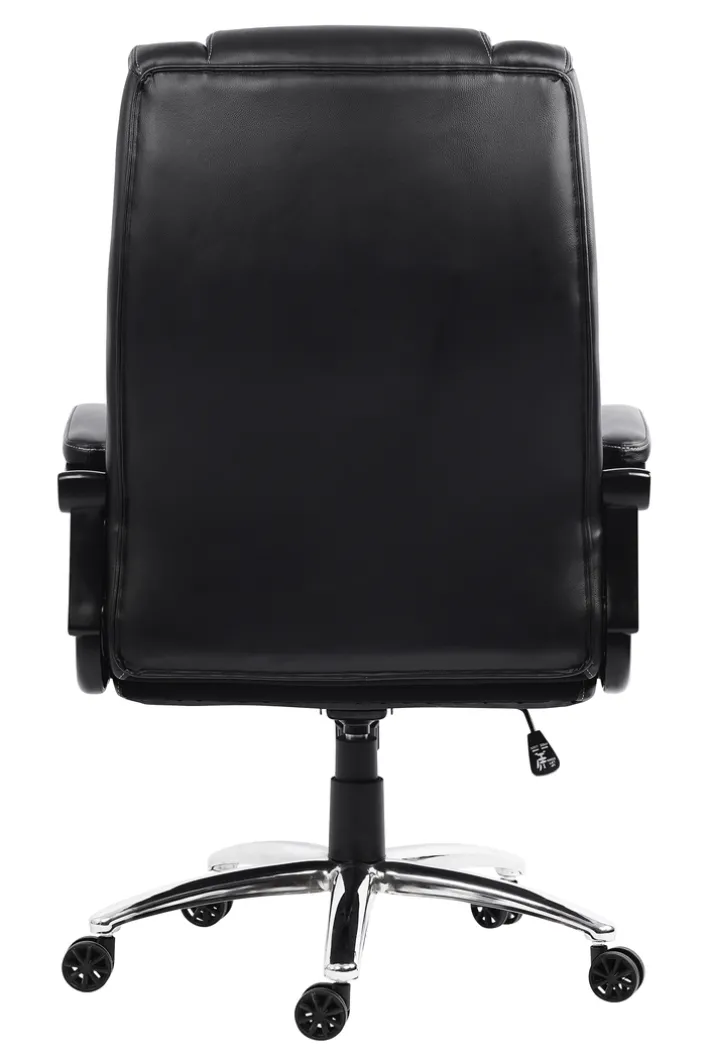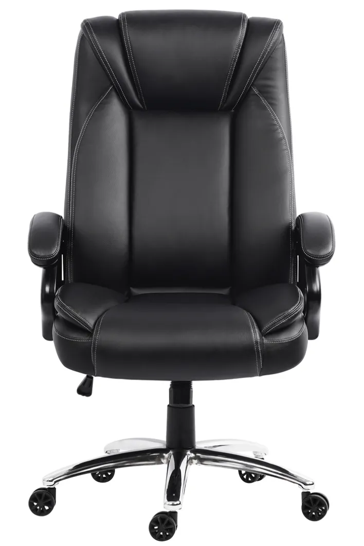 Der Bürostuhl der Serie AUSTIN präsentiert sich in einem modernen Design mit einer klaren, schwarzen Farbgebung und sichtbaren, kontrastierenden weißen Ziernähten. Die Sitzfläche, Rückenlehne und Armlehnen sind gepolstert und mit einer glatten Oberfläche aus Synthetikfaser, genauer Polyvinylchlorid (PVC), bezogen. Die feste Polsterung sorgt für Komfort im Arbeitszimmer und die Armlehnen sind ebenfalls fest montiert.