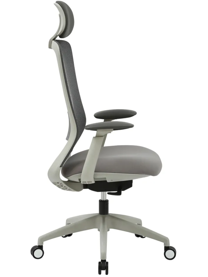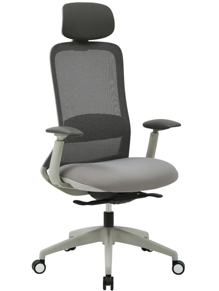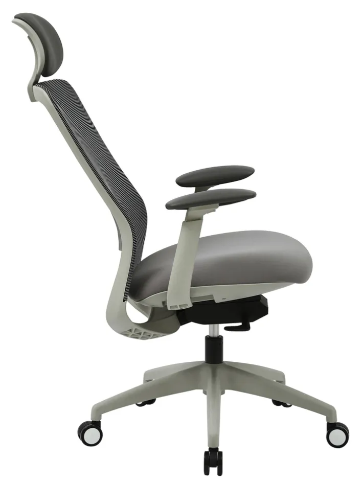 Der Bürostuhl aus der Serie KAYA vereint modernes Design mit funktionaler Vielseitigkeit. Der Stuhl ist in einem eleganten Grauton gehalten, der durch ein alufarbiges Metallgestell ergänzt wird. Der Stoffbezug besteht aus einem hochwertigen Mesh-Material aus 100 % Polyester, das für Atmungsaktivität und Komfort sorgt. Die verstellbare Kopfstütze und die Armlehnen bieten zusätzlichen Komfort und Unterstützung, während die Wippmechanik und die manuelle Höhenverstellung eine individuelle Anpassung ermöglichen.