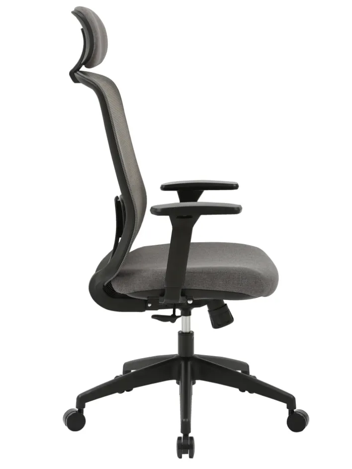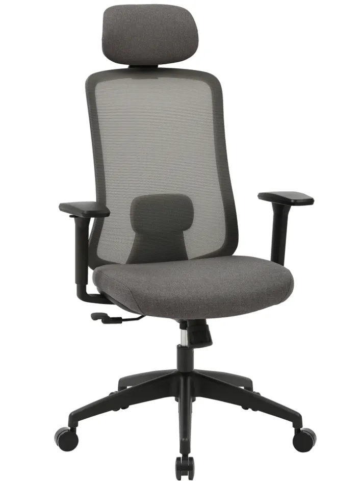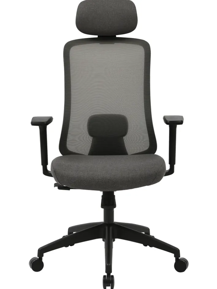 Der Bürostuhl „Maya“ vereint modernes Design mit funktionaler Ergonomie. Der Stuhl ist in einem eleganten Grau gehalten, das durch den Stoffbezug und das schwarze Gestell harmonisch ergänzt wird. Die Sitzfläche und die Kopfstütze sind mit einem strapazierfähigen Textil aus 100% Polyester bezogen, während die Rückenlehne aus atmungsaktivem Mesh-Material besteht, das für optimalen Komfort sorgt. Die Armlehnen und das Fußkreuz sind aus robustem Kunststoff gefertigt, was dem Stuhl Stabilität und Langlebigkeit verleiht.