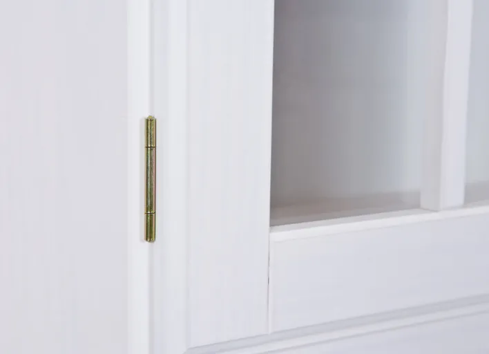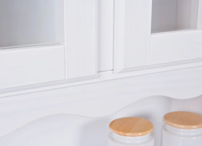 Das Buffet ADRIAN aus weiß lackiertem Kiefer Massivholz kombiniert einen Vitrinenteil mit einem Schrankbereich. Während sich in der Vitrine Familienporzellan und Gläser zur Schau stellen lassen, nimmt der Schrankteil das übrige Geschirr auf. Dank zwei Einlegeböden sind die unterschiedlichen Teller und Tassen jederzeit griffbereit. Außerdem bietet das Buffet zwei geräumige Schubkästen, in denen das Besteck sicher und staubgeschützt verwahrt ist.