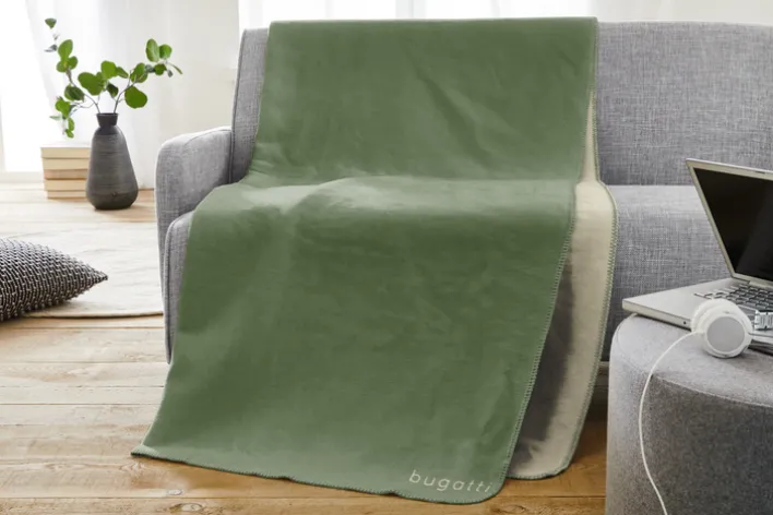 Mit der 150 x 200 cm großen bugatti Wohndecke in frühlingshaftem Grün lässt es sich an kühlen Frühlings- und Sommerabenden herrlich kuscheln. Die Decke bietet natürlich nicht nur eine herrlich weiche Oberfläche, mit ihrer Wendeoptik wirkt sie zudem äußerst stylisch.