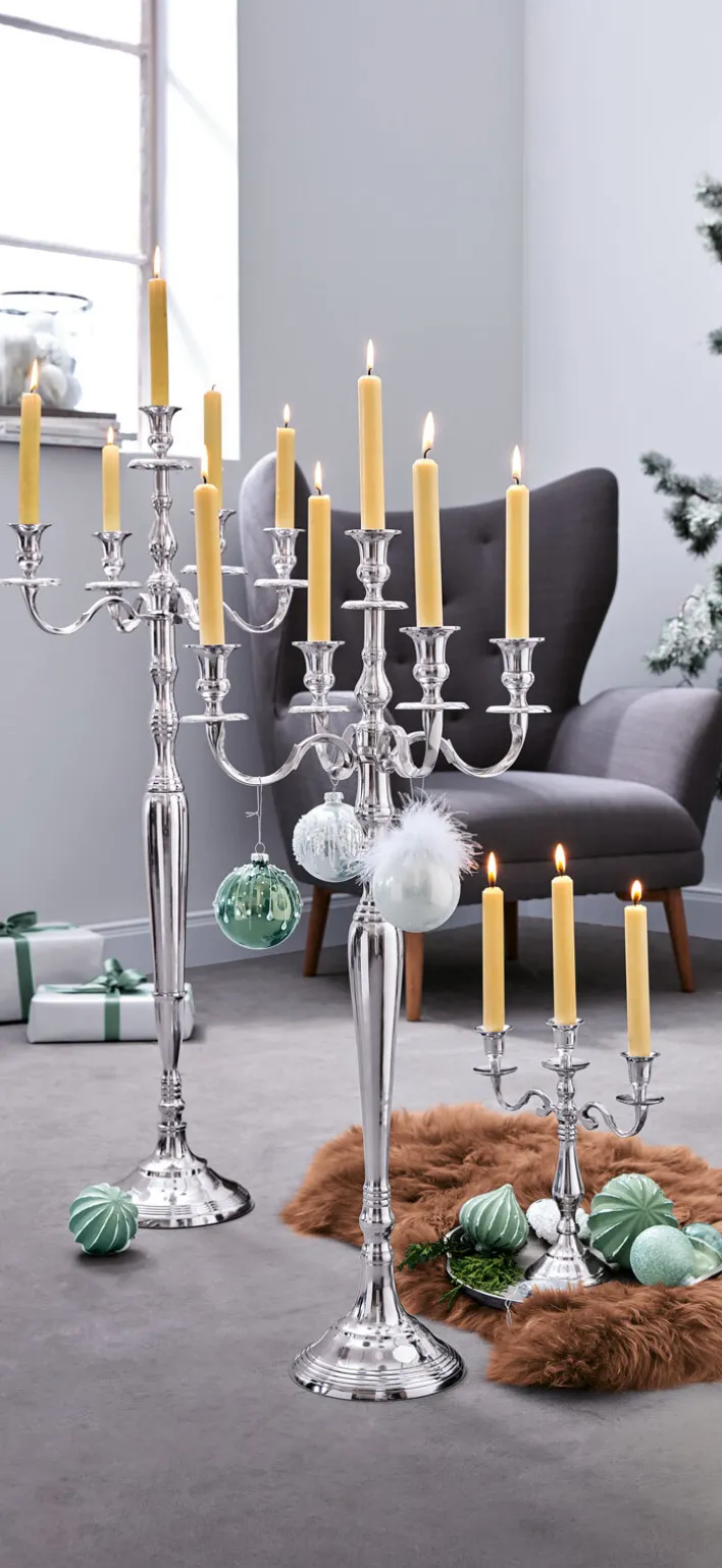 Der 5-armige Kerzenleuchter SCHNEEZAUBER aus dem Hause casaNOVA ist 80 cm hoch. Er bezaubert mit seiner eleganten Form, deren edle Ausstrahlung durch die glänzende, silberfarbige Oberfläche verstärkt wird.